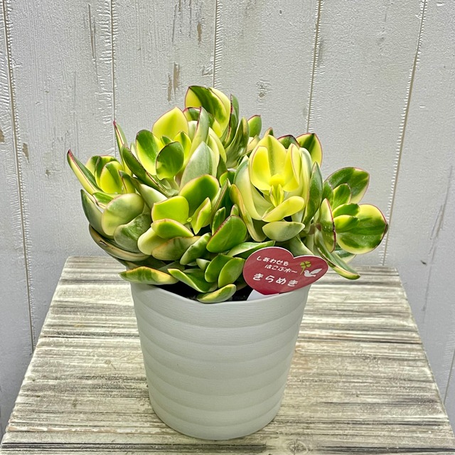 発色の美しさで人気の高い、花月(カネノナルキ)“きらめき”のご紹介です。 やわらかな黄斑が葉の縁までふわっと広がり、日差しを受けるとまるで光をまとったように見える、とても可愛らしい品種です。 5号鉢(15cm)にしっかりと株立ちしたサイズで、手にした瞬間に存在感を感じていただけると思います。 飾った場所の空気まで明るくしてくれるような、やさしい佇まいが魅力です。 “きらめき”は寒さに比較的強く、初心者の方にも育てやすいのが嬉しいポイント。 ただし、霜に当たると傷むことがありますので、冬場に気温がマイナスへ下がる地域では、ビニールをかけてあげたり軒下へ移動してあげると安心です。 大切に育てていくと、秋〜冬にかけてピンク色のお花を咲かせてくれます。 葉だけでなく花も楽しめるので、長く寄り添ってくれる一鉢としておすすめです。 ■サイズ 5号鉢(15cm) 高さ H20〜25cm前後(鉢底からの計測) ※生きものですので多少個体差がございます。