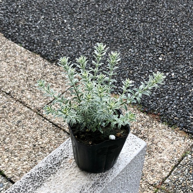 入荷量が少ない、斑入りのウエストリンギアの〝スモーキーホワイト〟です。 久々に入荷致しました! ウエストリンギアは、 通称オーストラリアン・ローズマリーとも呼ばれていて、ローズマリーにも似た葉っぱが美しい常緑低木。 枝葉は柔らかく、シルバーホワイトの葉っぱはとても涼しげな雰囲気を感じます。 小さい株アクセントとして、大きな株に育てば主役にもなりかわります。 常緑低木ですので年間を通して楽しめます。 大株に育つと、春-秋に白色のかわいい花を咲かせてくれるのも嬉しい所。 こちらのウエストリンギアは、 株立ちタイプです。 こじんまり見えますが、程よく剪定が施されていて、間延びがありません。 締まった株ですよ♪ ぜひオシャレなテラコッタに植えて下さい。 夏-秋のお花が少ない時期のテラスの主役として活躍しますよ(o^^o) 育て方 1年を通して日当たりの良い場所に置き育てて下さい。 霜が降りない暖地でしたら地植えも可能です。 水 土が乾いたらたっぷりと水をあげて下さい。 乾燥には比較的強いですが、乾燥させすぎると葉っぱが落ちますのでご注意ください。 真夏は朝夕2回あげてください。 サイズ W約25-30cm×H約25-30cm前後 鉢下から先端まで。 5号スリット鉢 多少の個体差はございます。