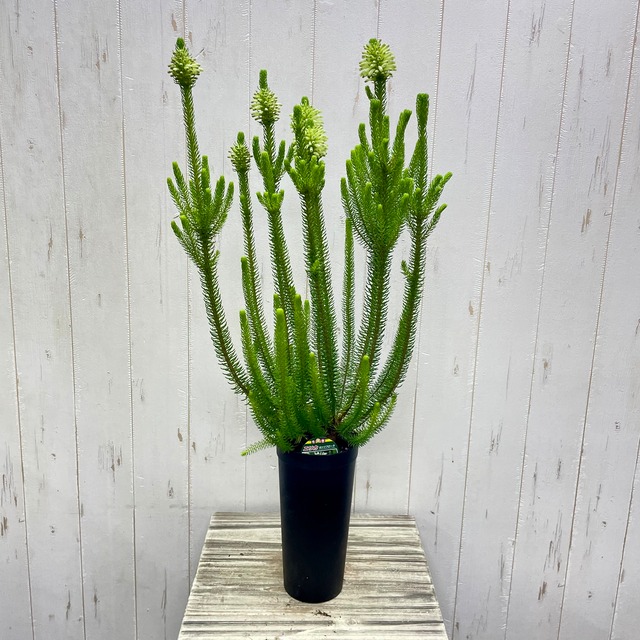 エリカ・セシリフローラは、冬の時期に白からライムグリーンへと移ろう可憐な花を咲かせる品種です。 硬く詰まった葉が美しく、独特のフォルムは飾るだけで空間をすっきりと引き締めてくれます。 今回ご紹介する株はしっかりと充実した大株で、幹もしっかりと木質化しています。 ところどころに花を咲かせそうな箇所も見られ、冬の楽しみが広がる一鉢です。 ※必ず花芽が付いているわけではございません。 英名は Erica sessiliflora L.f. ユニークな姿を楽しめる人気の園芸品種です。 育て方 日当たりと風通しの良い場所で育ててください。 夏は半日陰で管理します。 耐寒性はおよそ0度ほどあり比較的強いですが、霜には当てないようにしてください。 サイズ 3.5〜4号ロング鉢 高さ 約70cm前後 多少個体差がございます。 日々成長していますので、画像の状態と異なる場合がございます。
