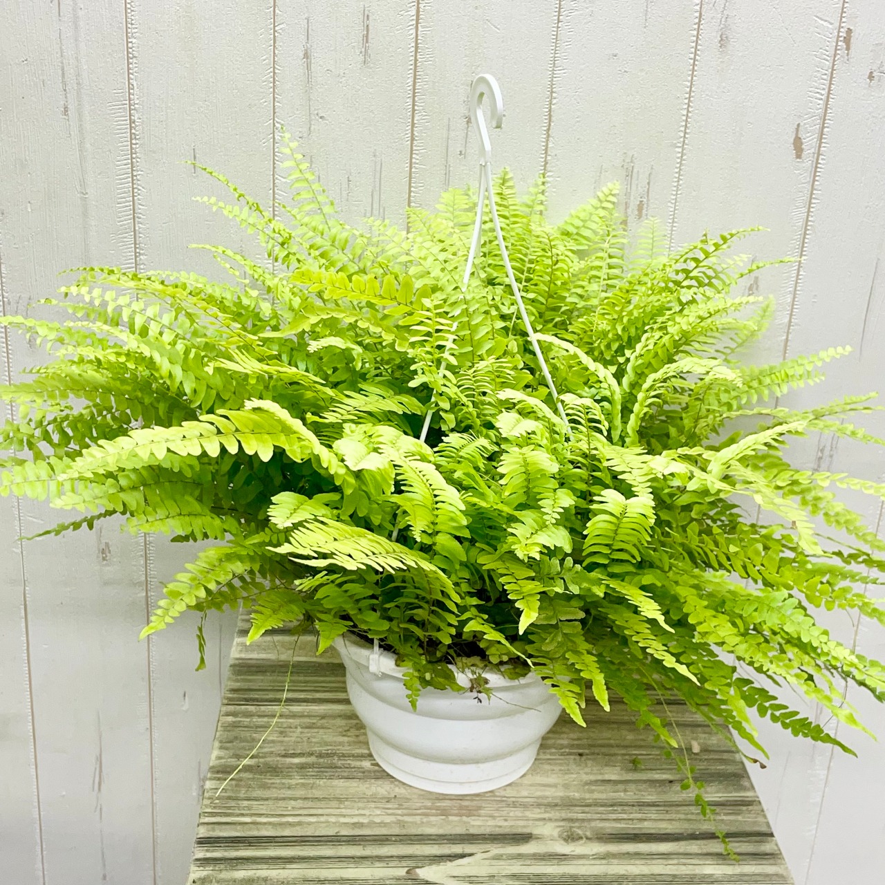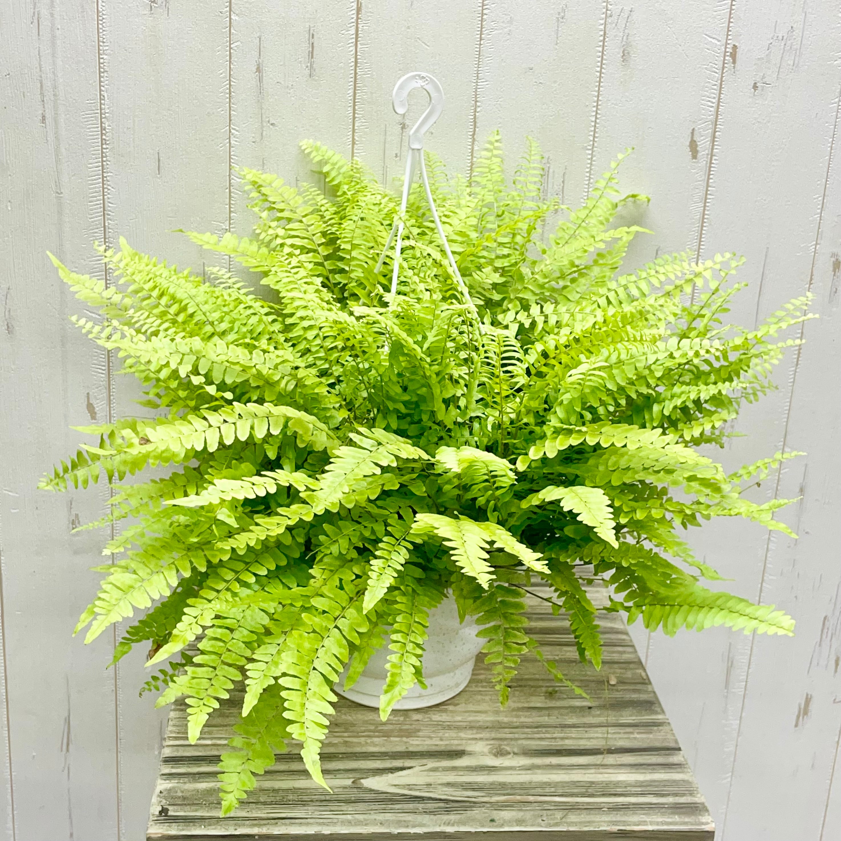 ふわふわと風になびくように広がる葉姿が美しい「ボストンファーン(ネフロレピス)」の吊り鉢タイプです。