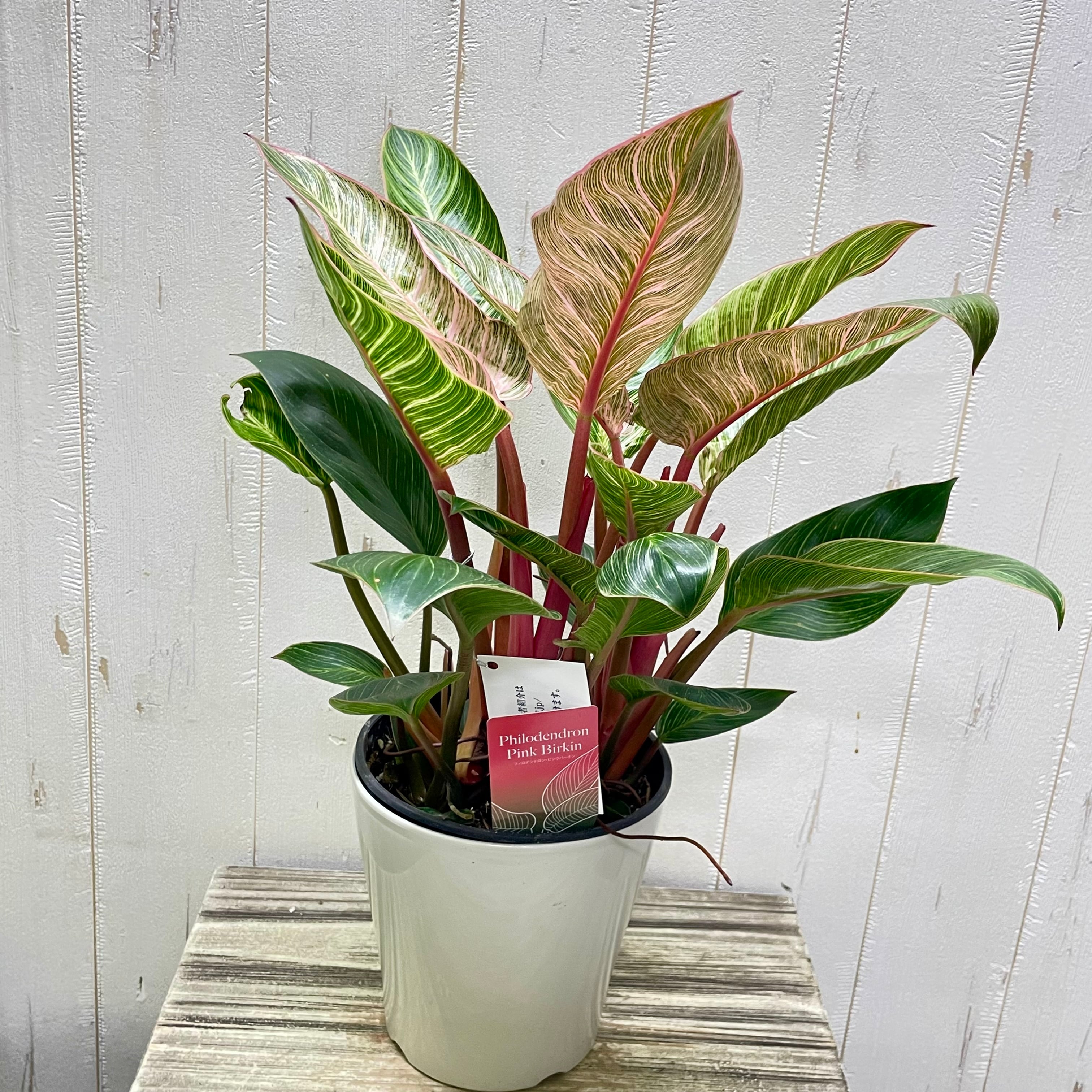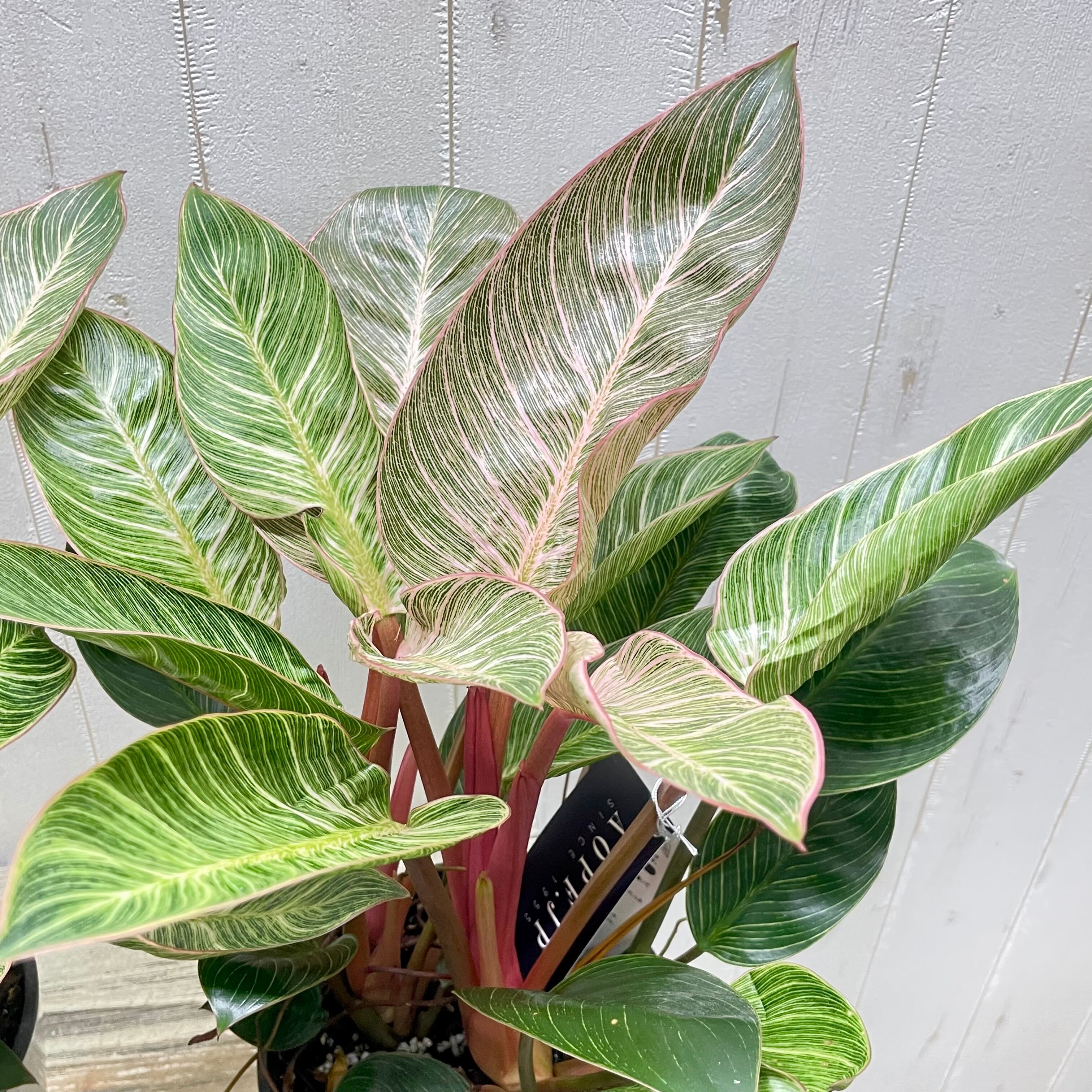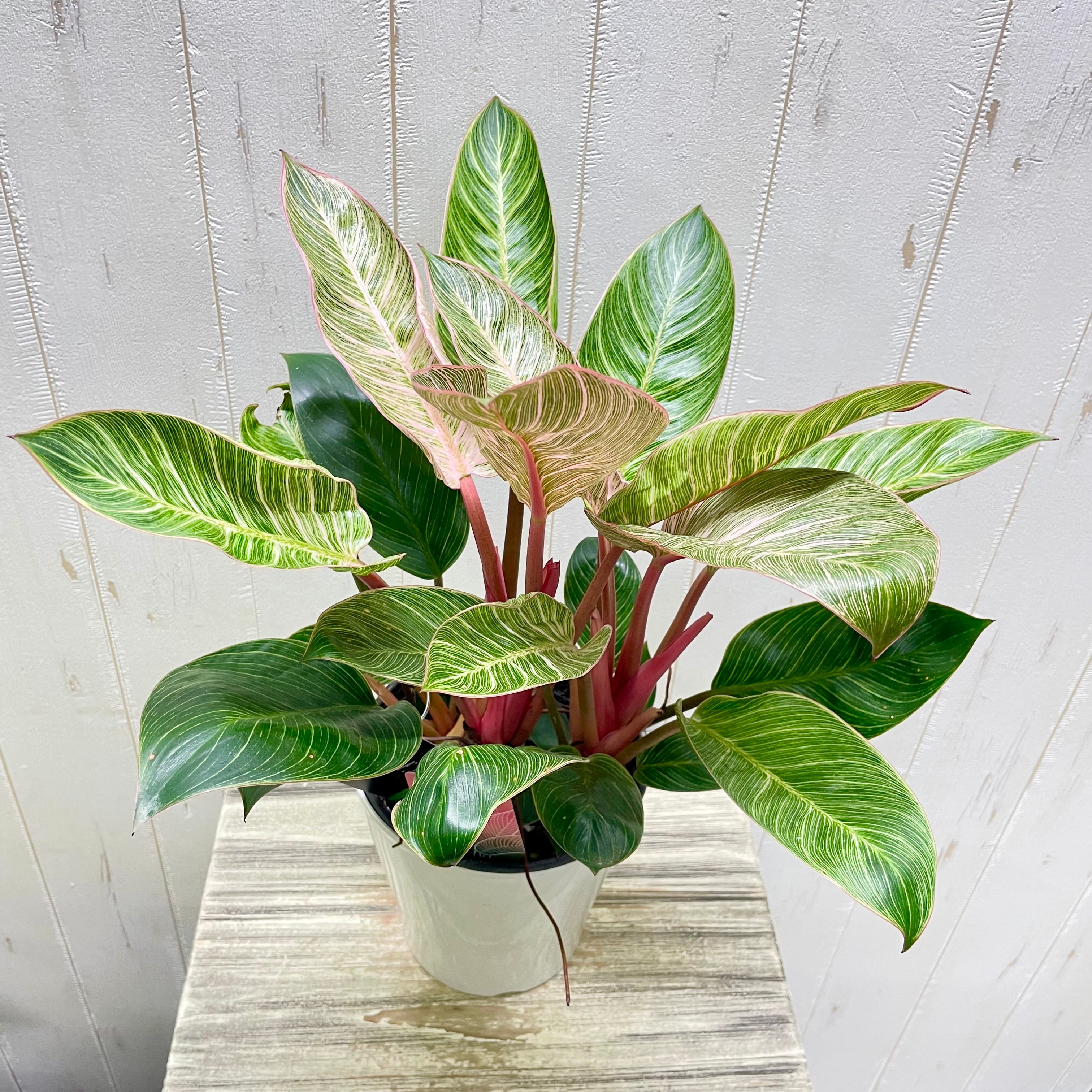 個性的な葉模様で人気のフィロデンドロン ピンクバーキン。ピンクやホワイトの繊細なストライプが、深いグリーンの葉に映え、存在感を放ちます。茎の赤色も美しく、インテリアに取り入れるとおしゃれな空間を演出してくれます。