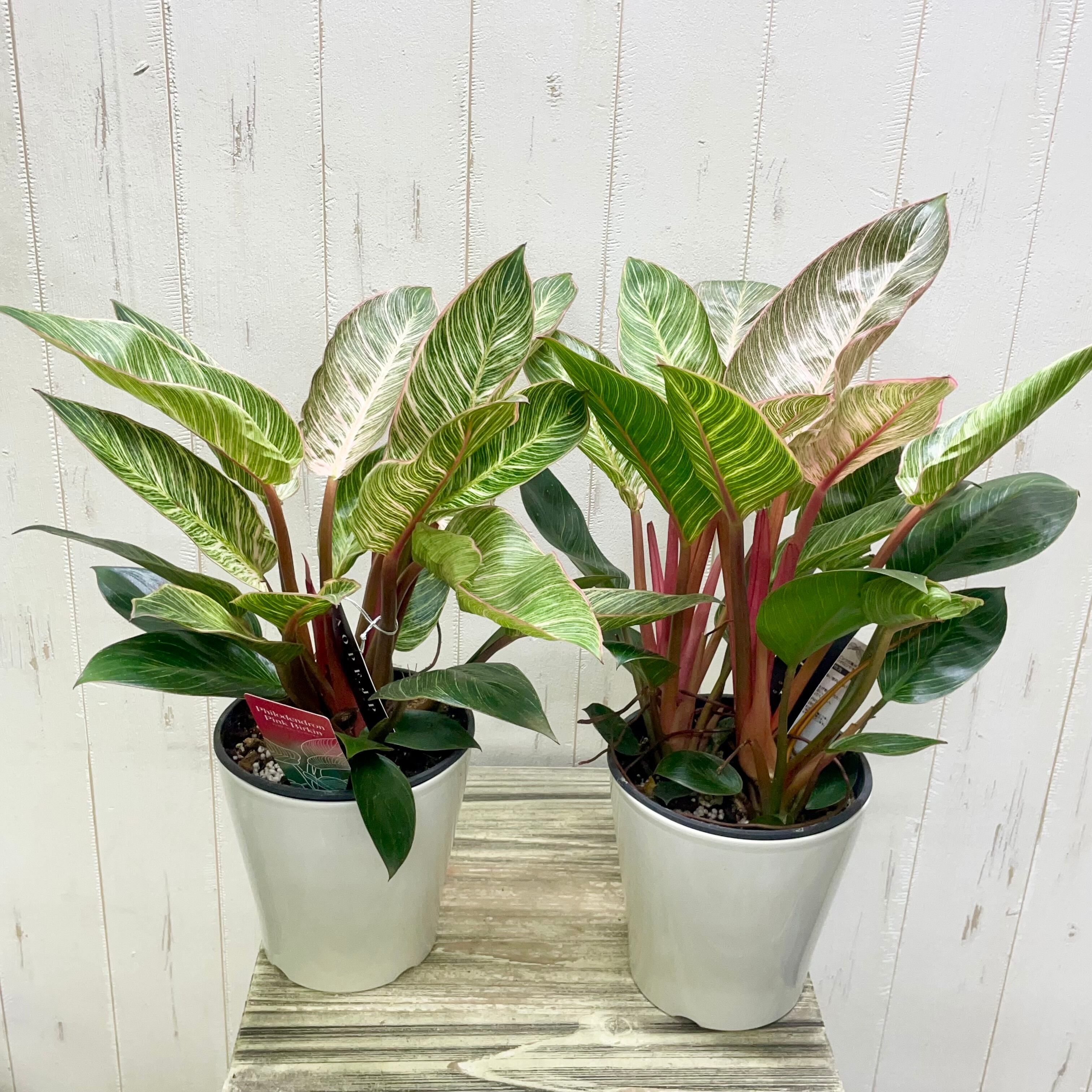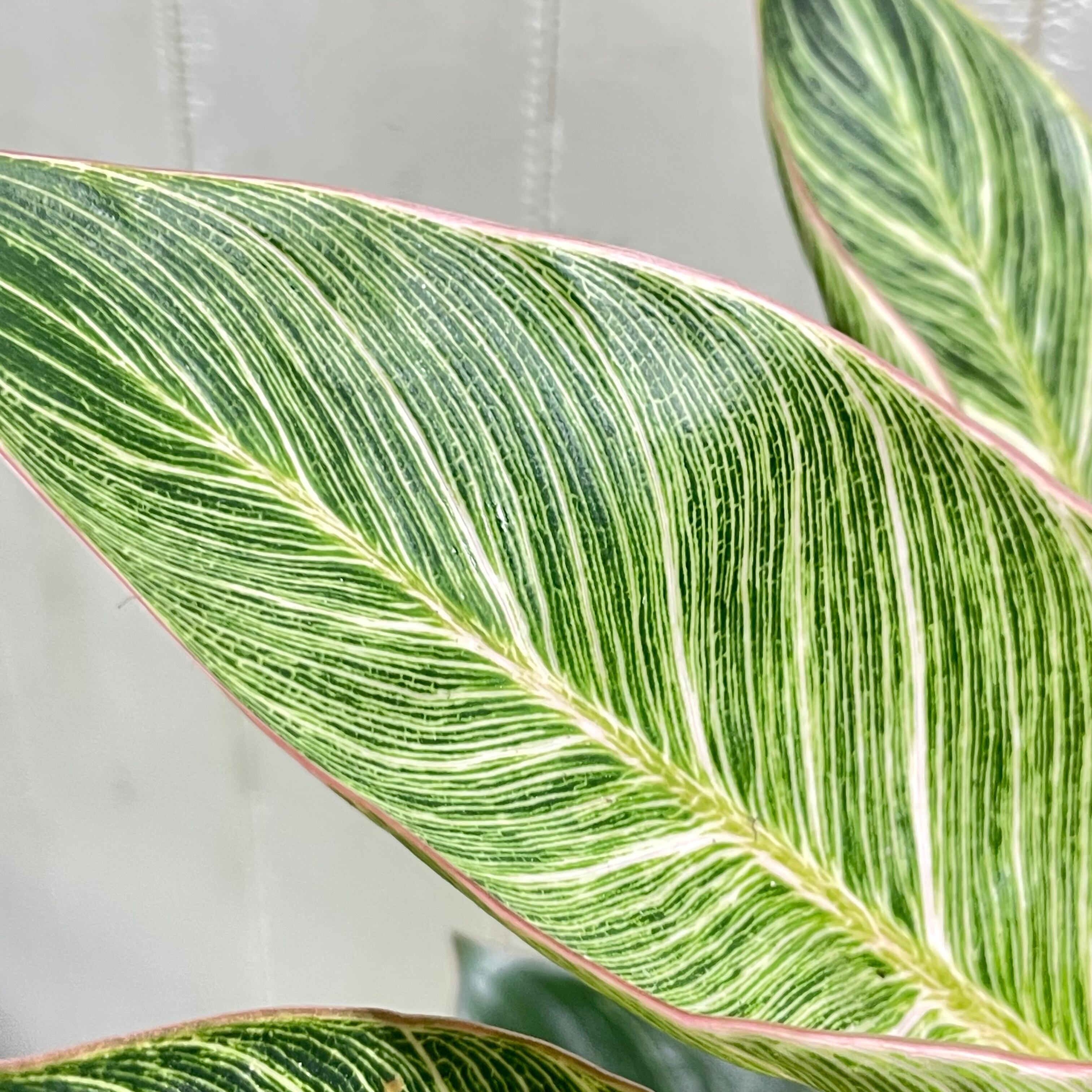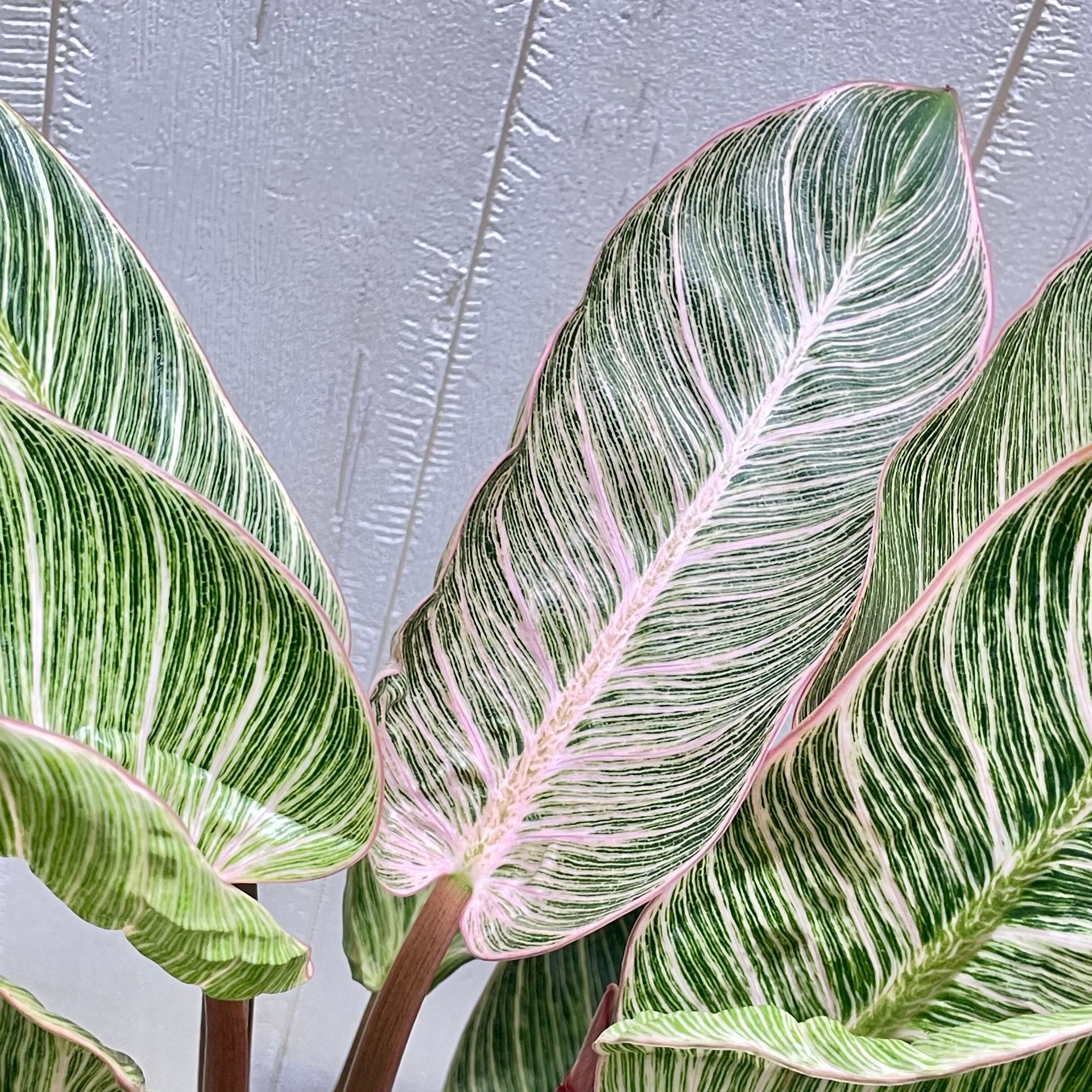 個性的な葉模様で人気のフィロデンドロン ピンクバーキン。ピンクやホワイトの繊細なストライプが、深いグリーンの葉に映え、存在感を放ちます。茎の赤色も美しく、インテリアに取り入れるとおしゃれな空間を演出してくれます。