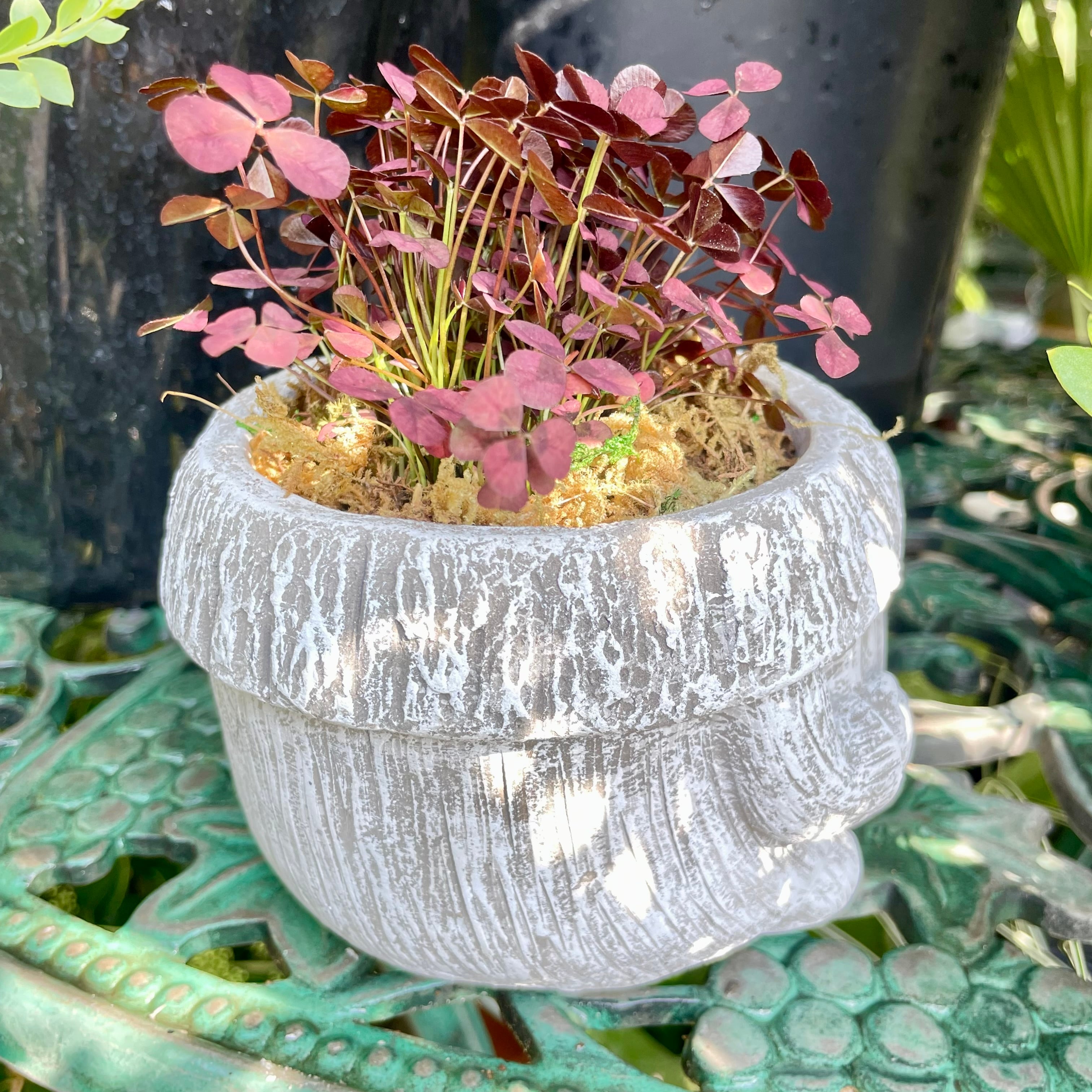 そんなノームの姿をかたどったアンティーク調セメントポットに、銅葉が魅力のトリフォリウム“ウィリアム”を植え込みました。