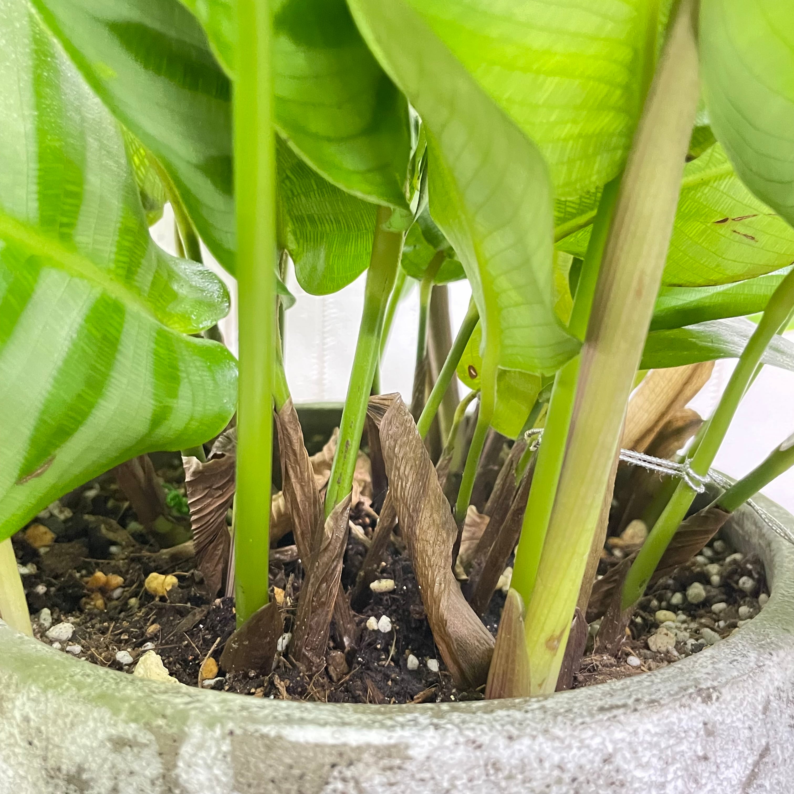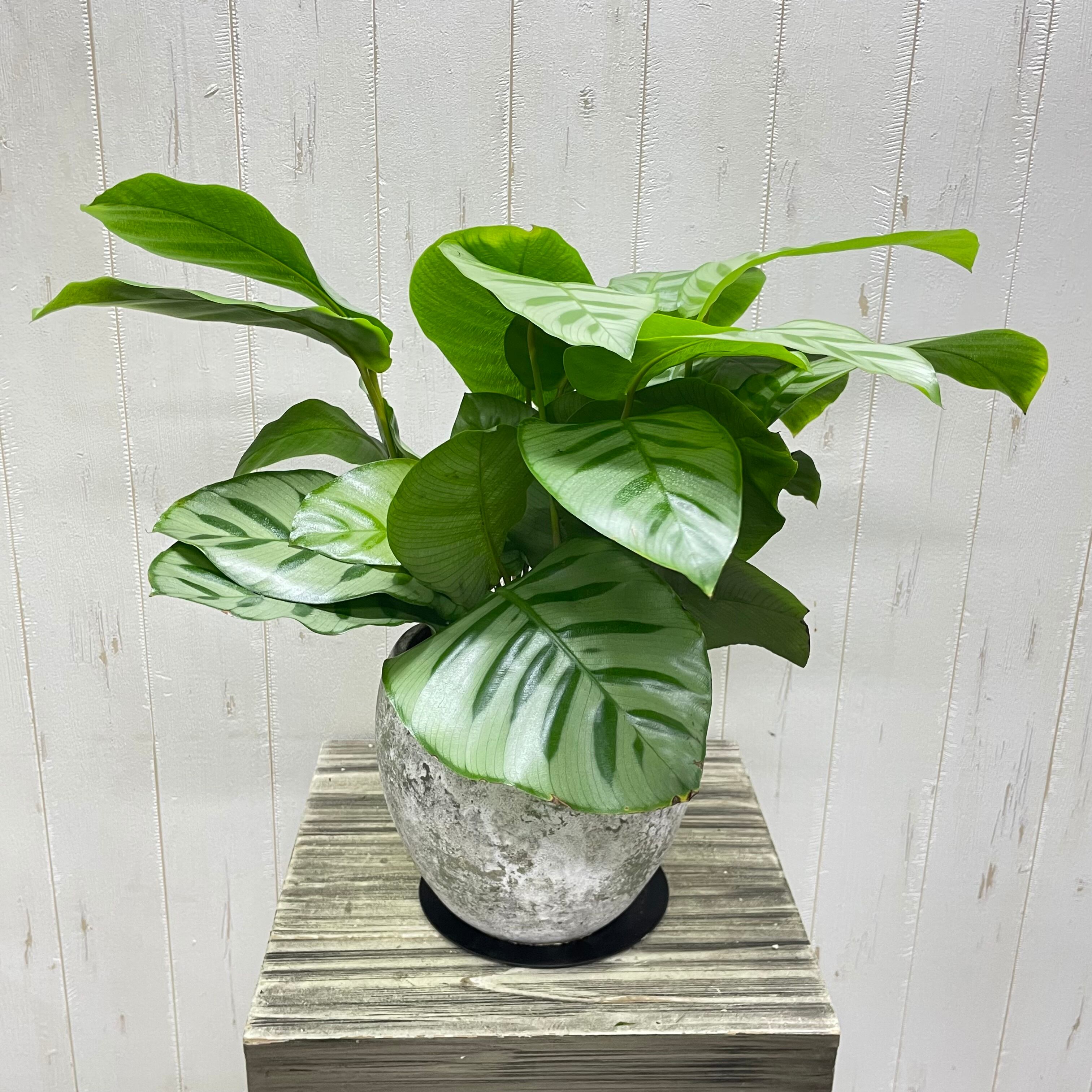 そんな“ゲッペルティア・ベラ”のカーリナが、アンティーク調の迷彩柄セメント鉢にぴったり映える一鉢になって入荷しました。