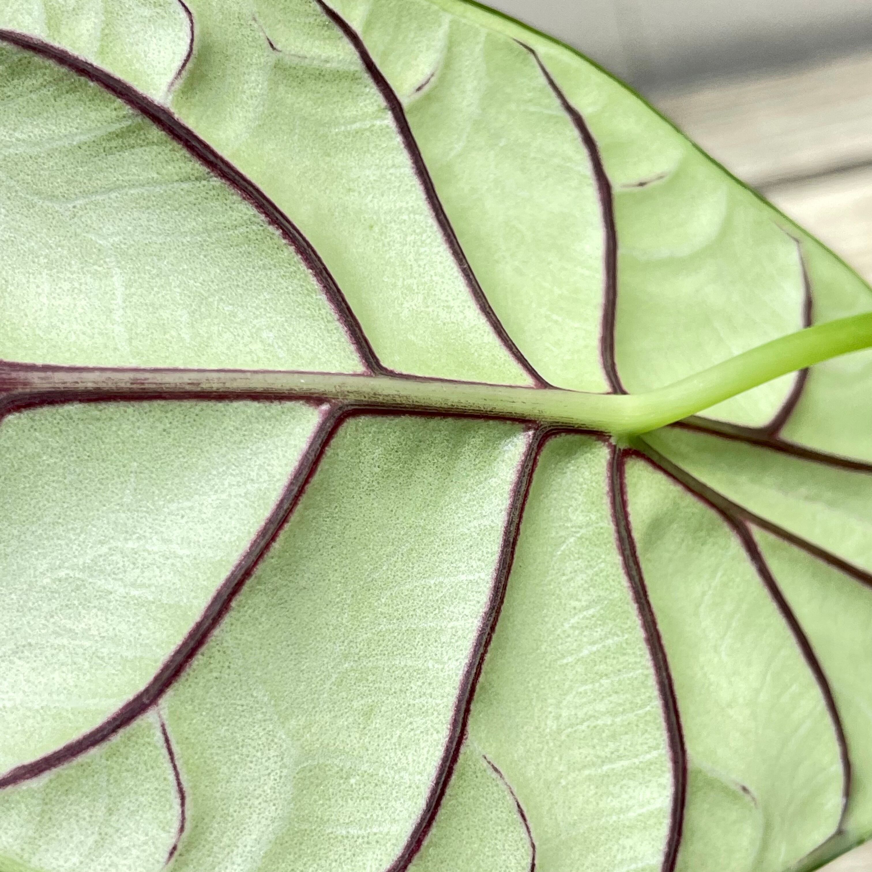 淡いライトグリーンに、赤紫色の葉脈がくっきりと入り、表とは全く違う表情を楽しめます。
