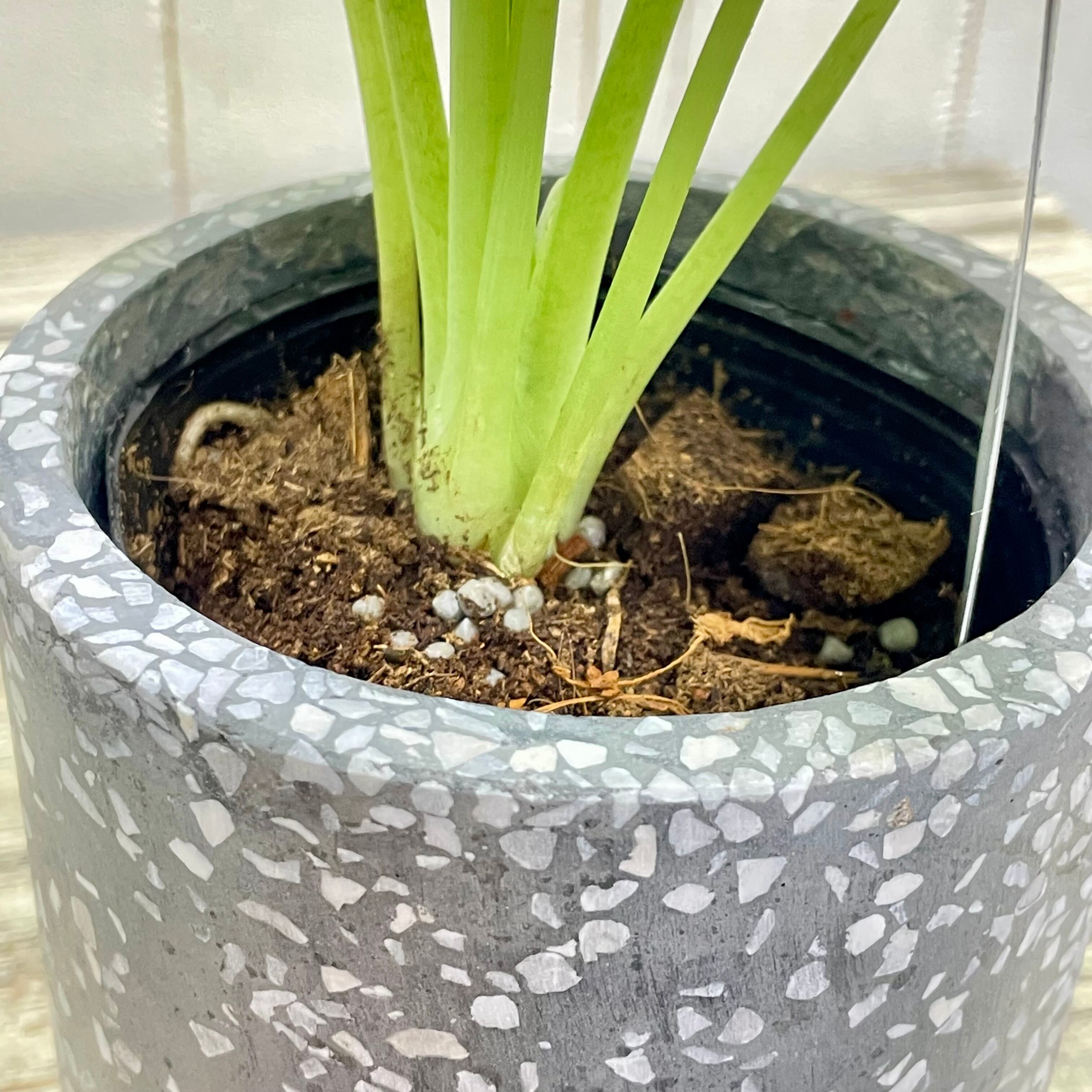 鉢カバーはセラミックス製の落ち着いたカラーで、植物との相性も抜群。
