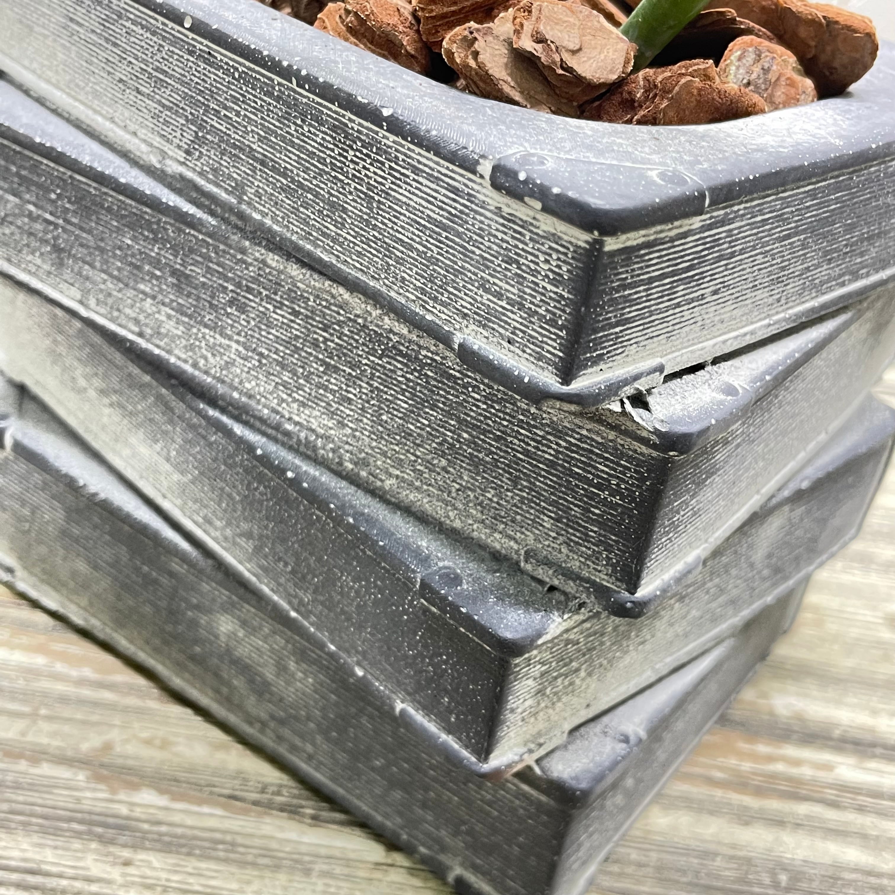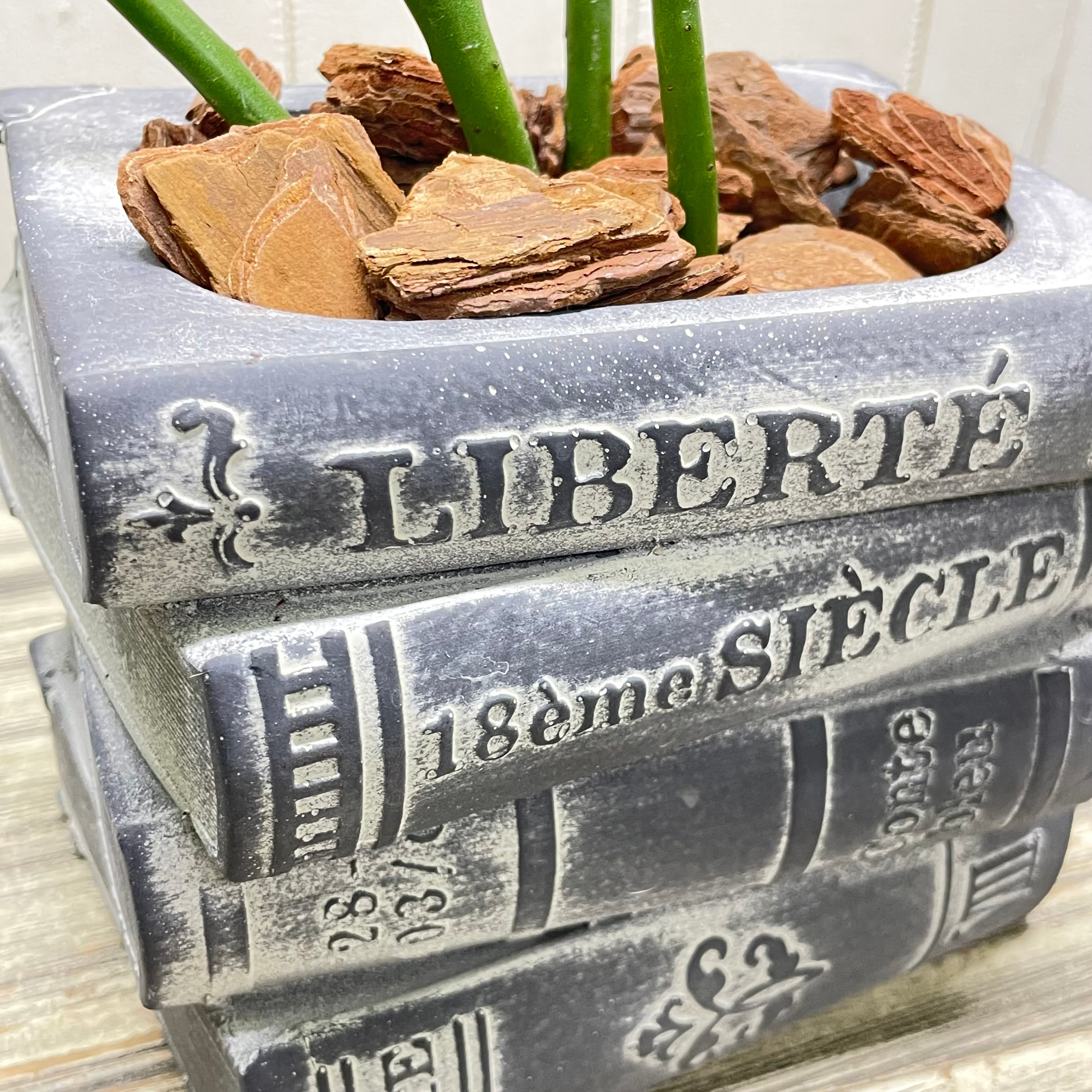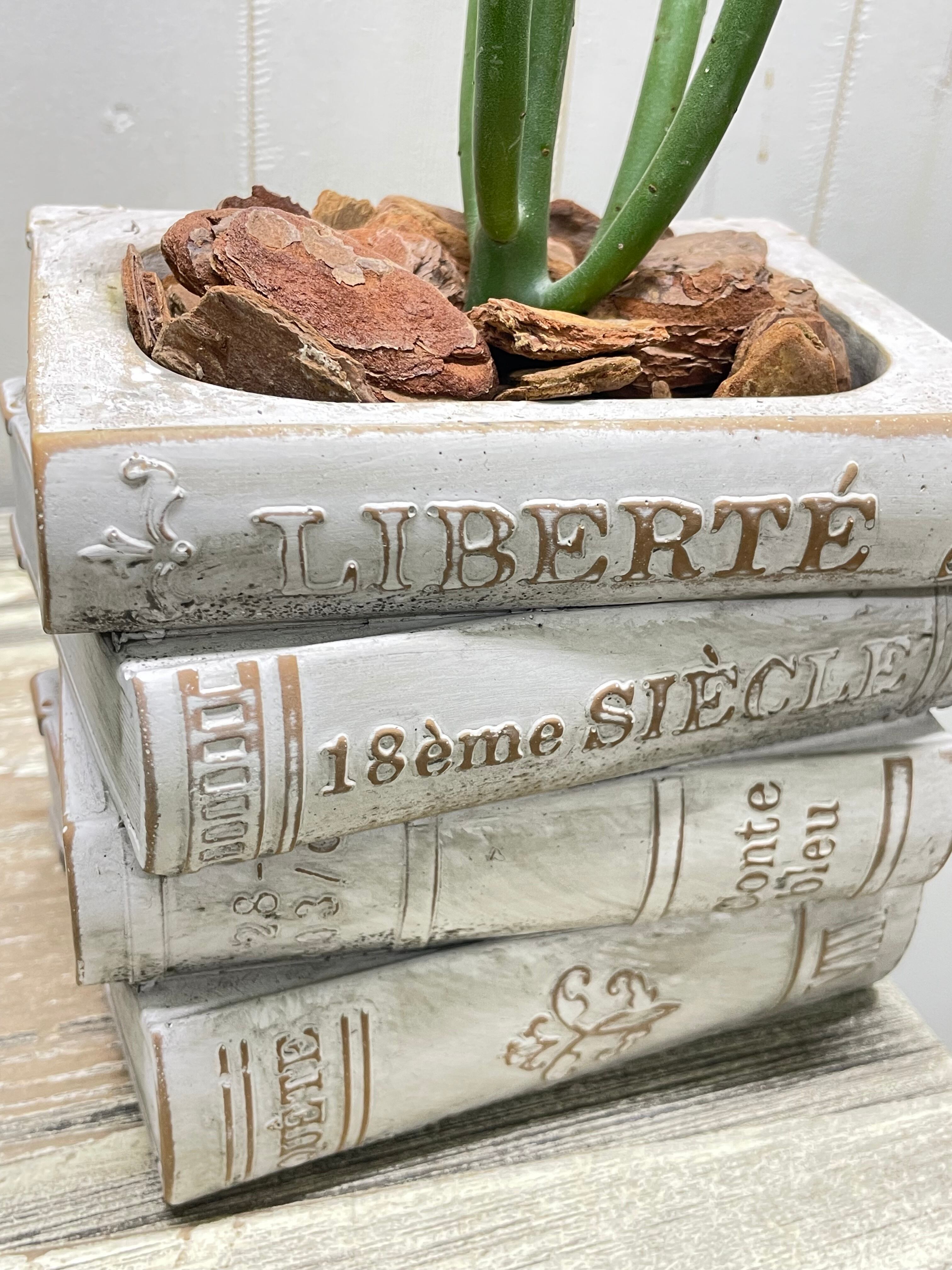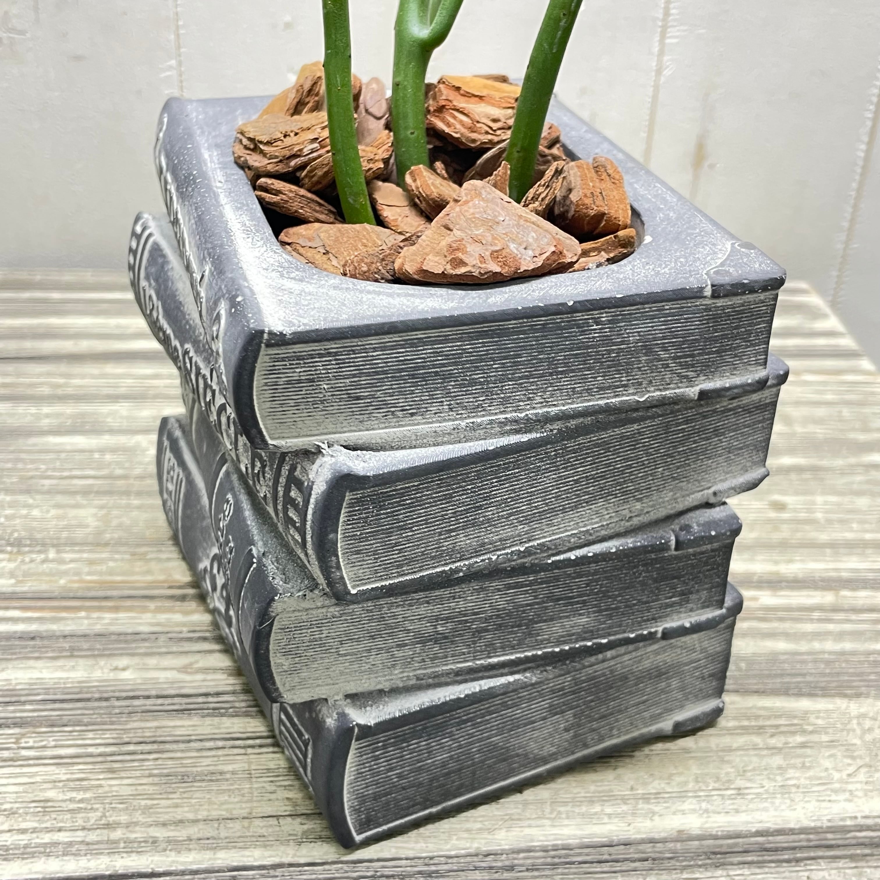 アンティーク風に仕上げられたセメント鉢は、本の背表紙やページのざらつきまで丁寧に再現され、まるで古書を積み重ねたような存在感があります。