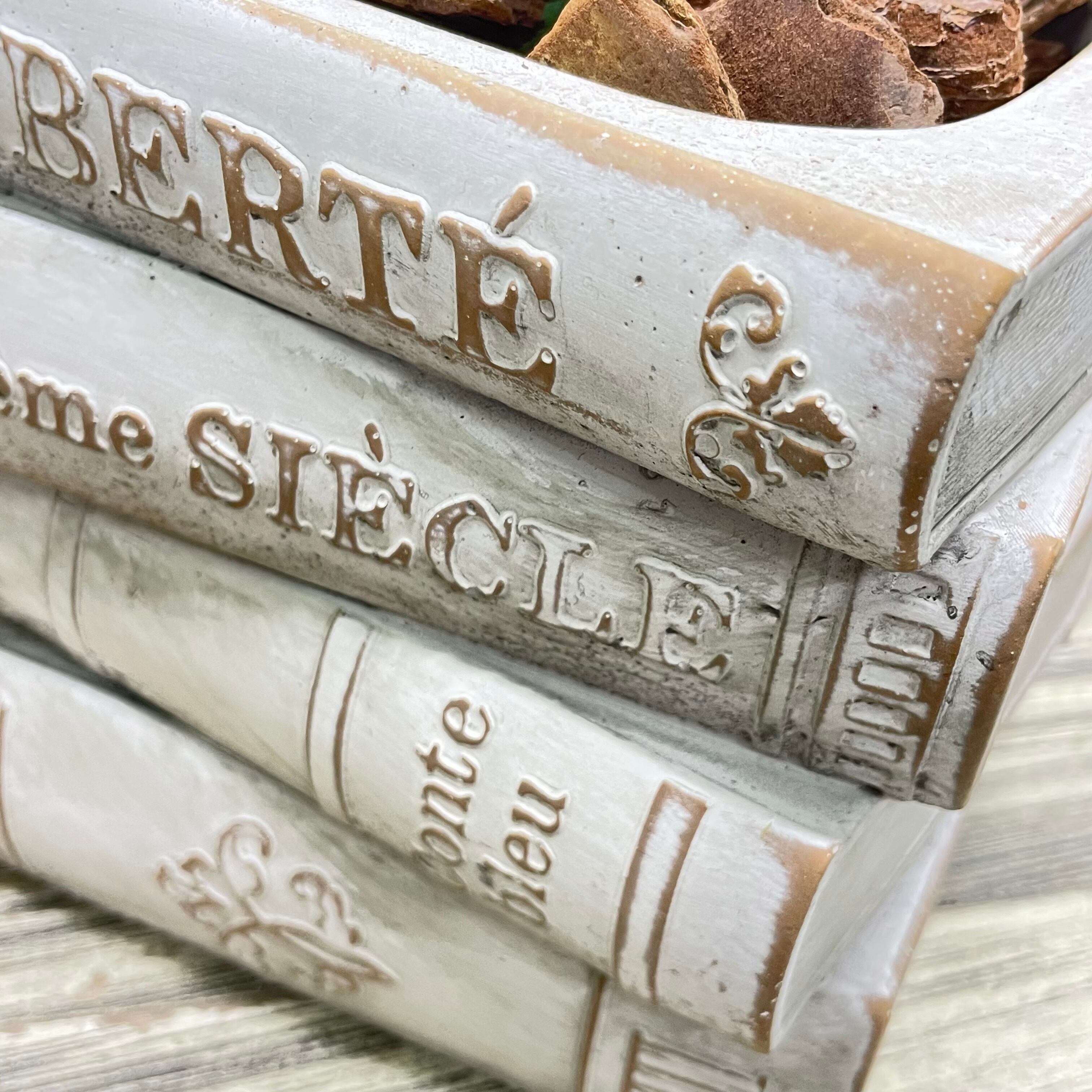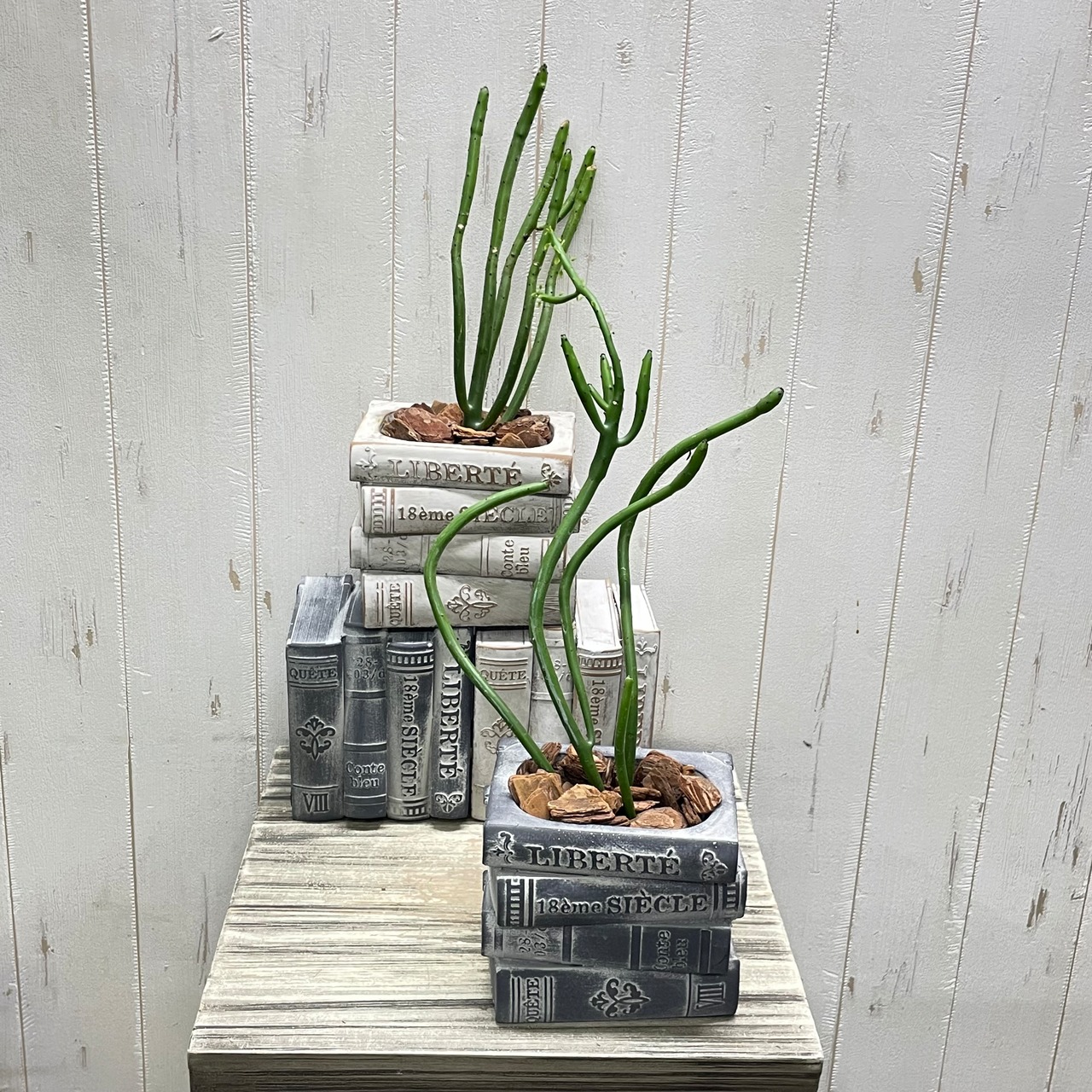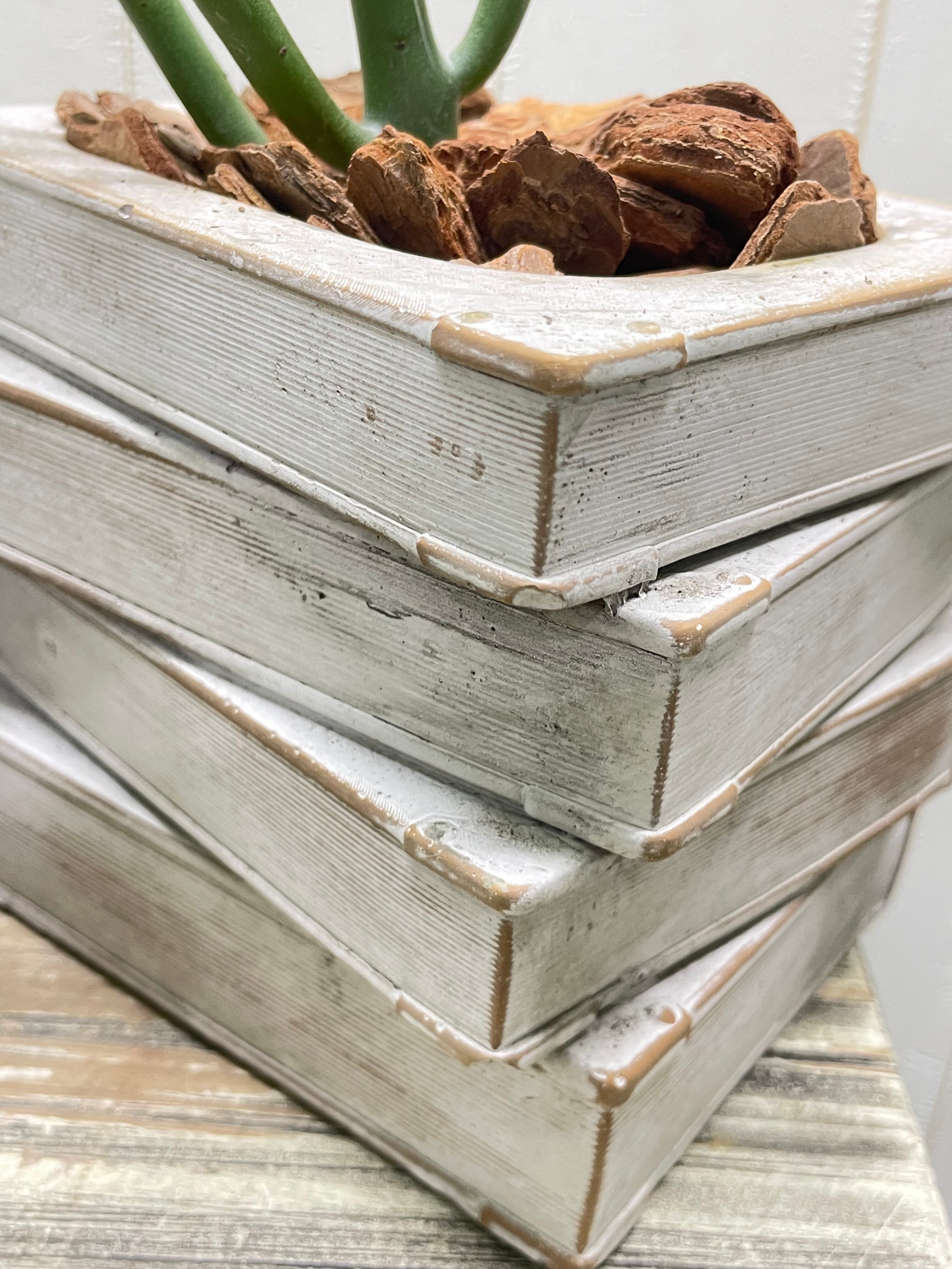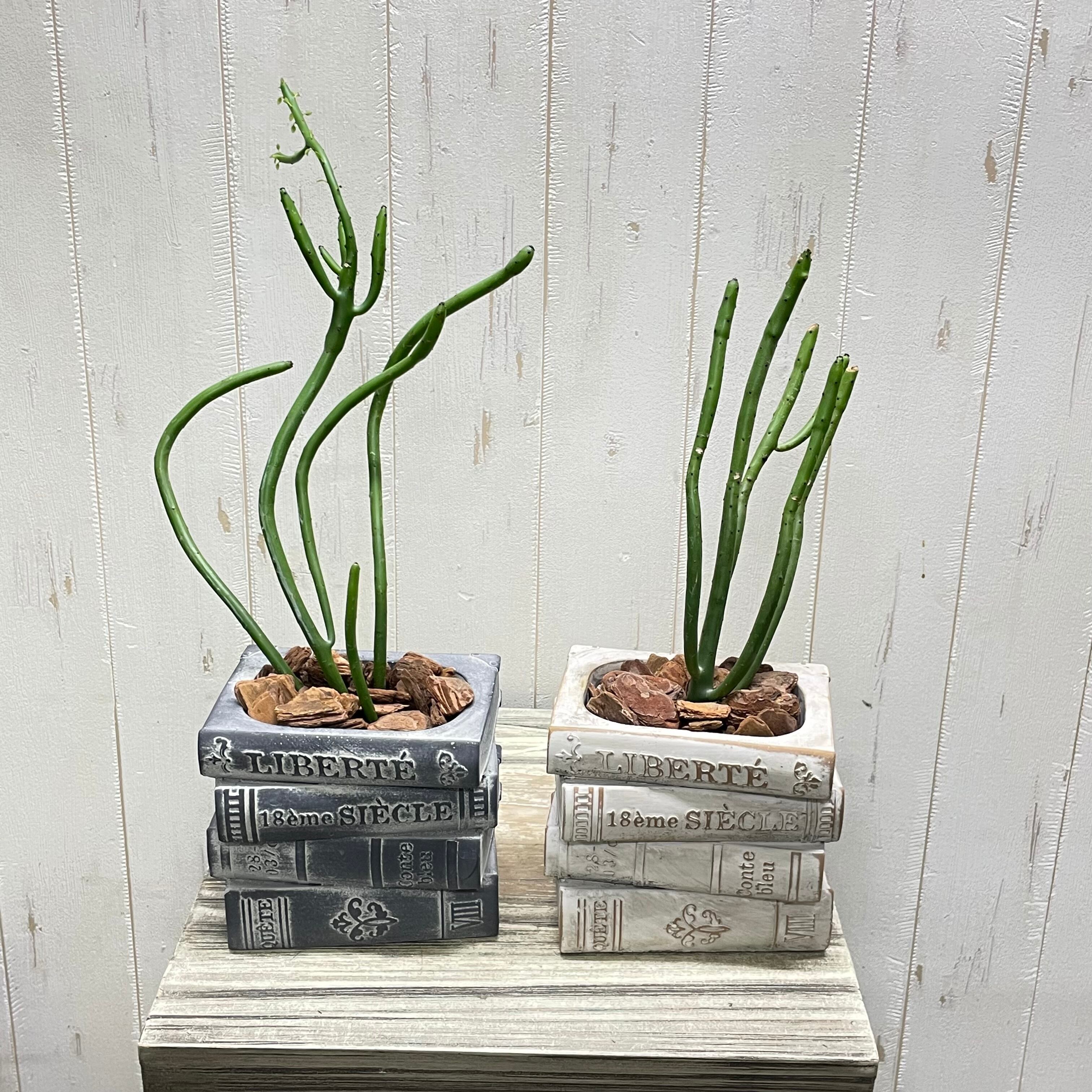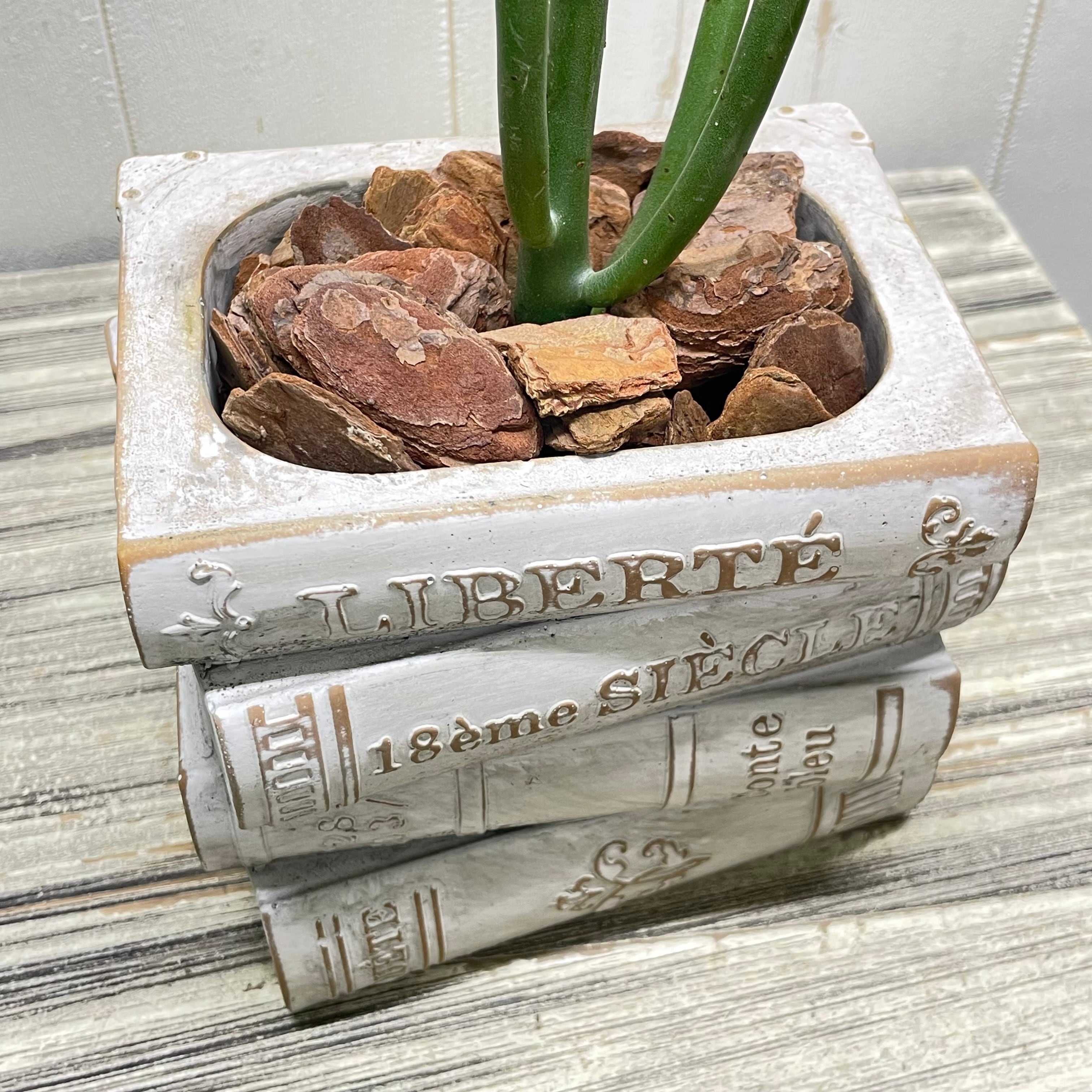 アンティーク風に仕上げられたセメント鉢は、本の背表紙やページのざらつきまで丁寧に再現され、まるで古書を積み重ねたような存在感があります。