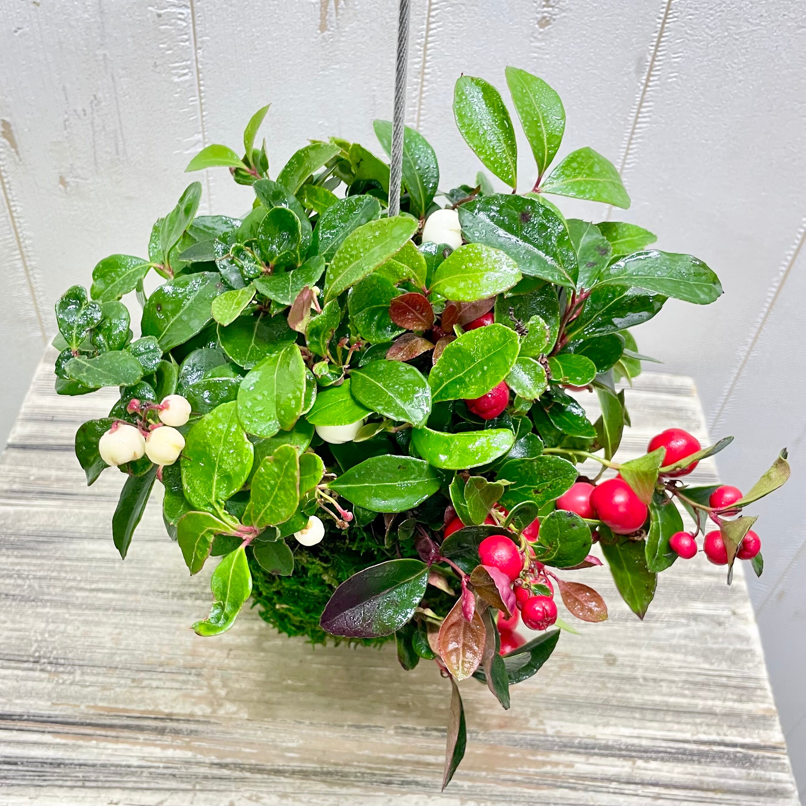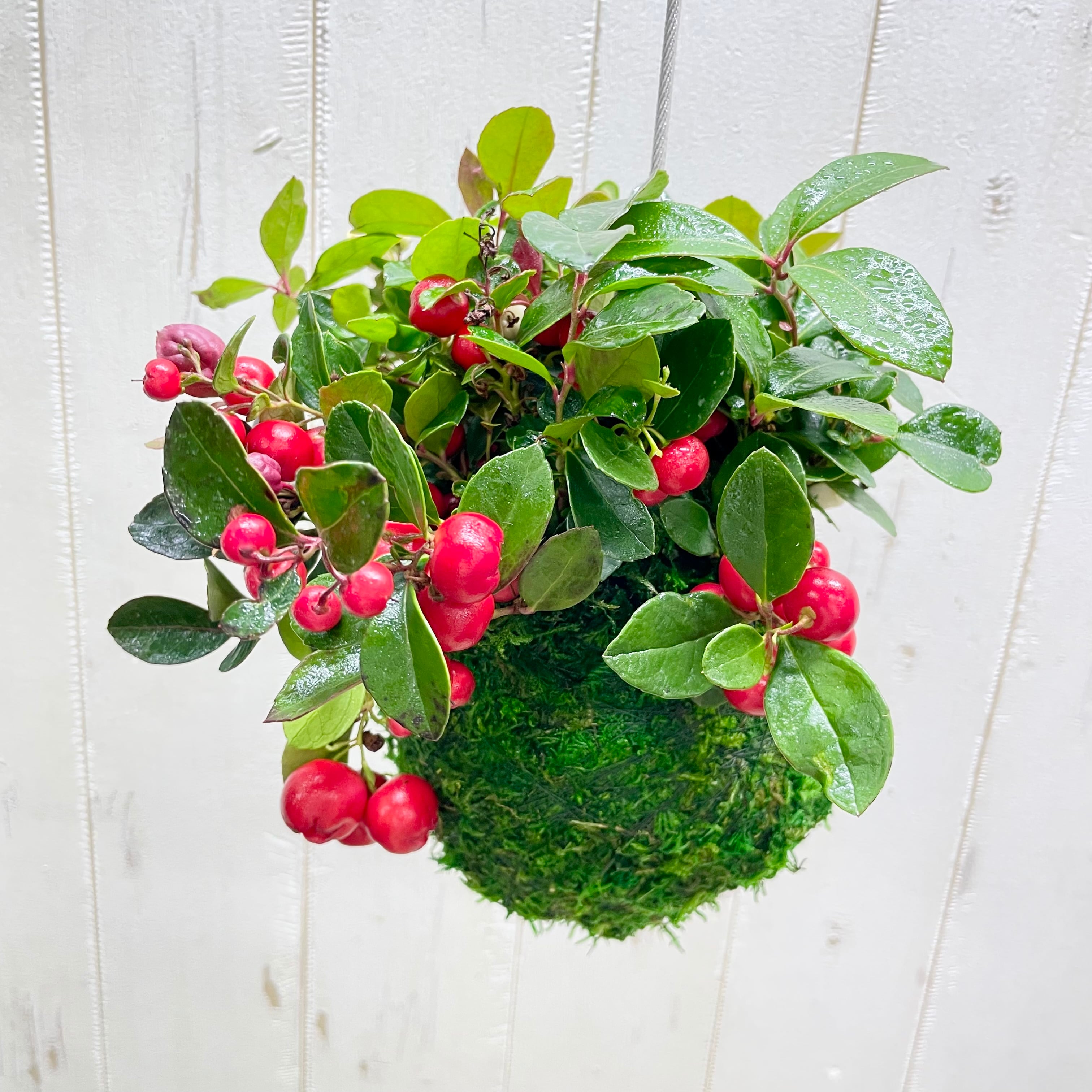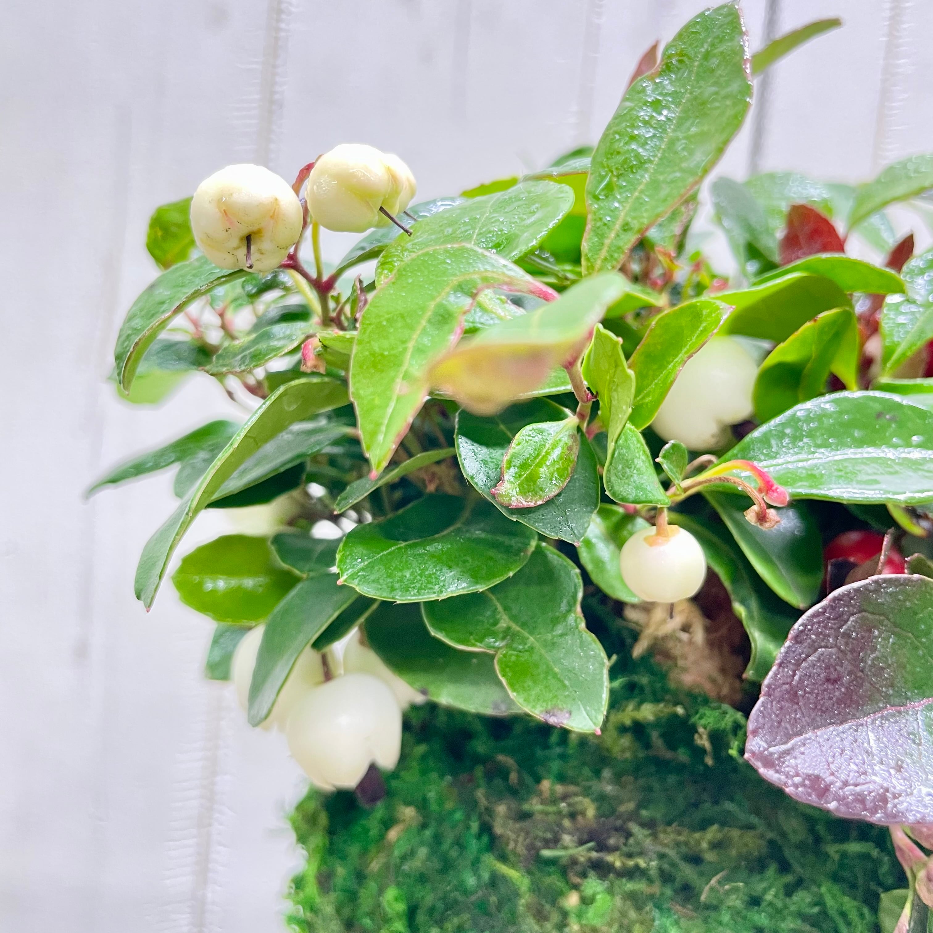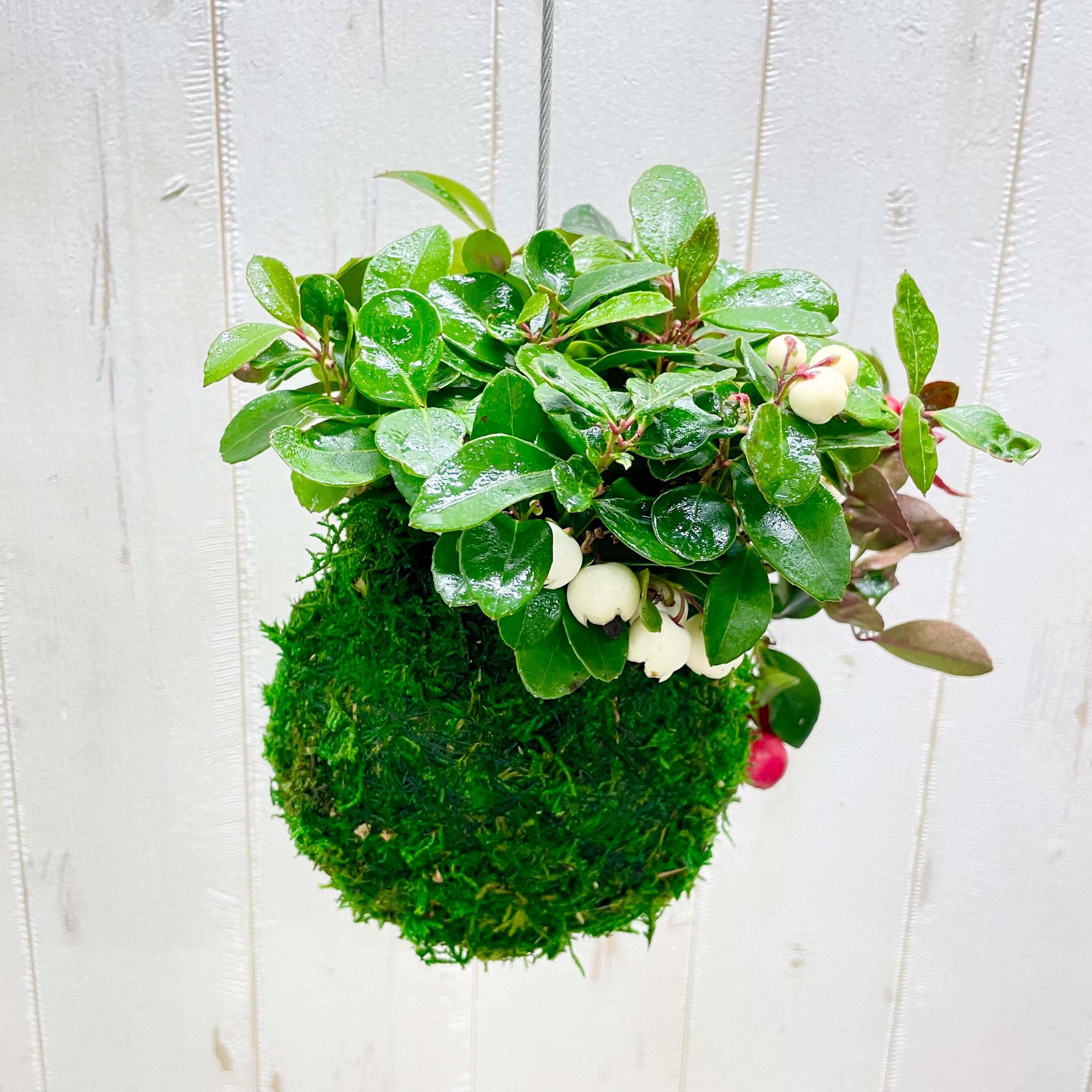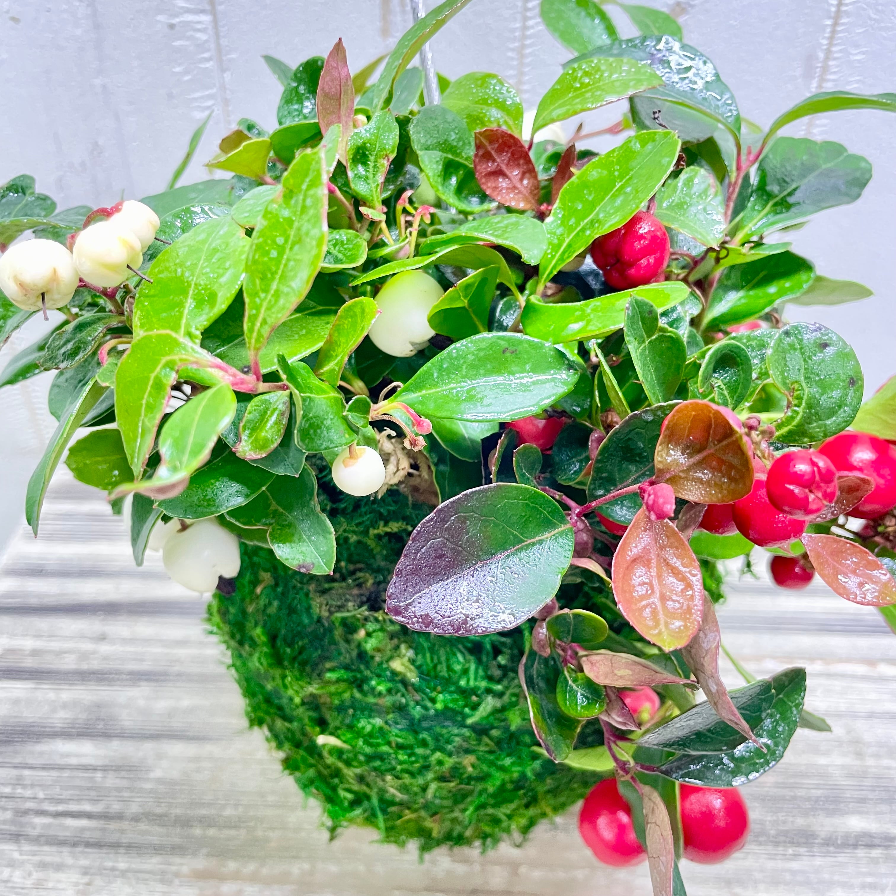 紅白チェッカーベリーの苔玉ハンギング|冬を彩る実ものインテリア