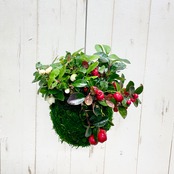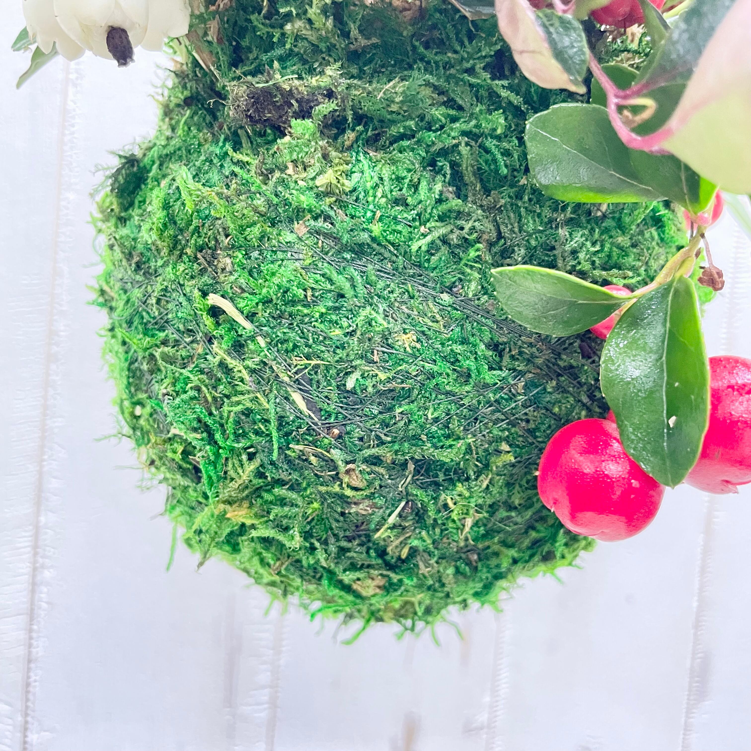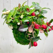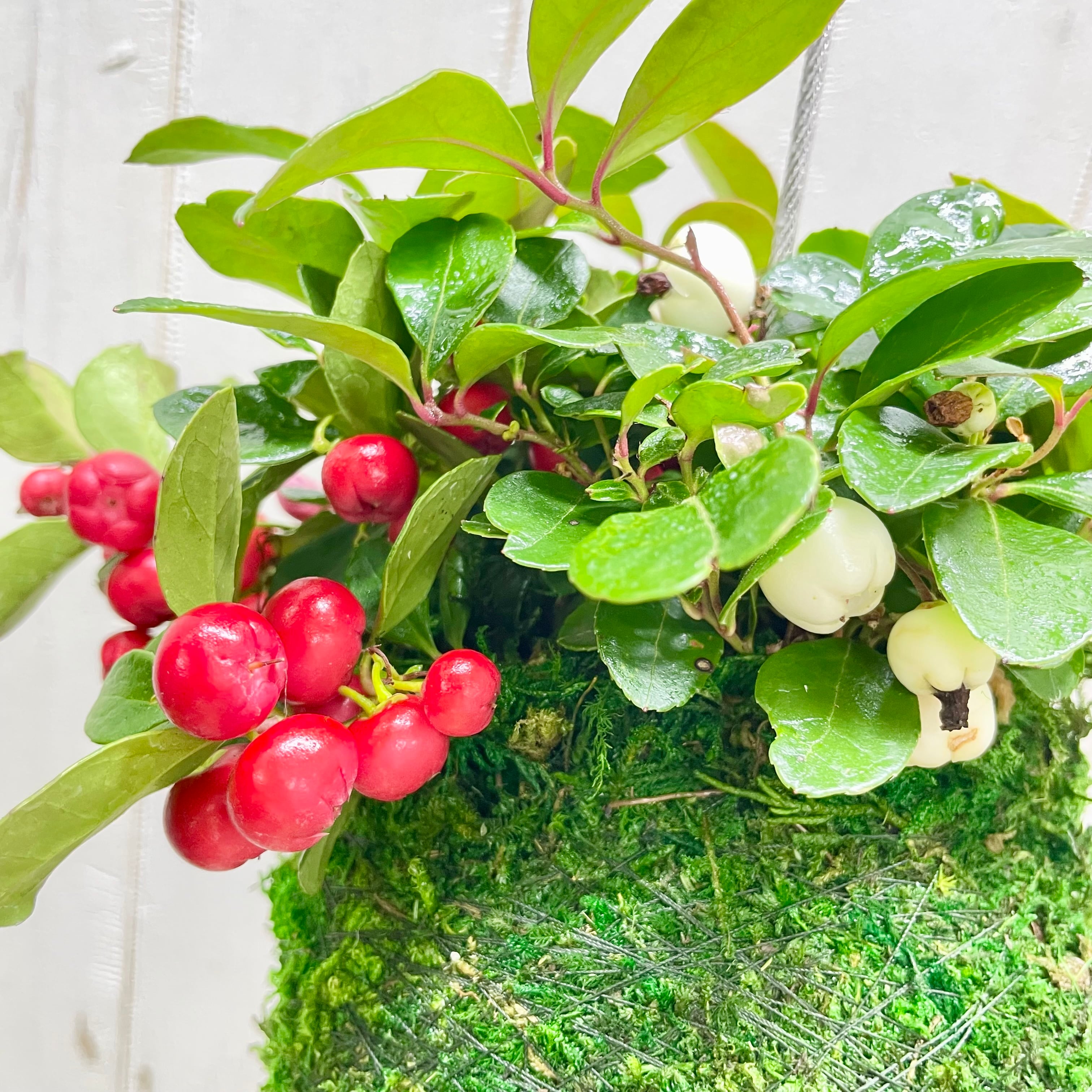 赤い実と白い実が寄り添う、冬だけの特別な苔玉ハンギングです。