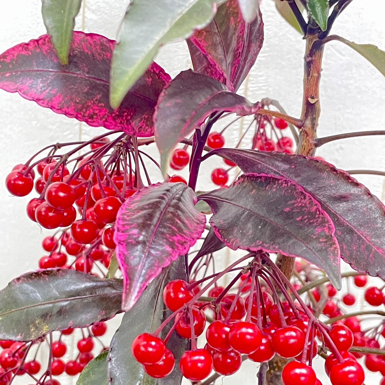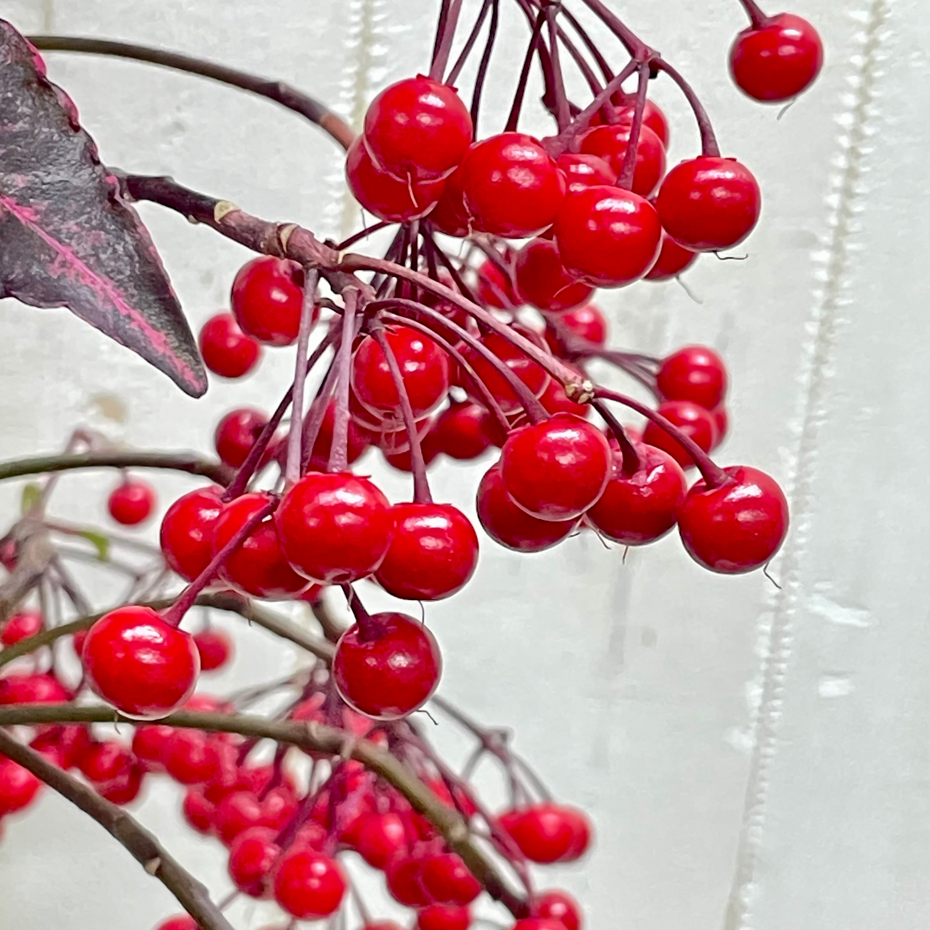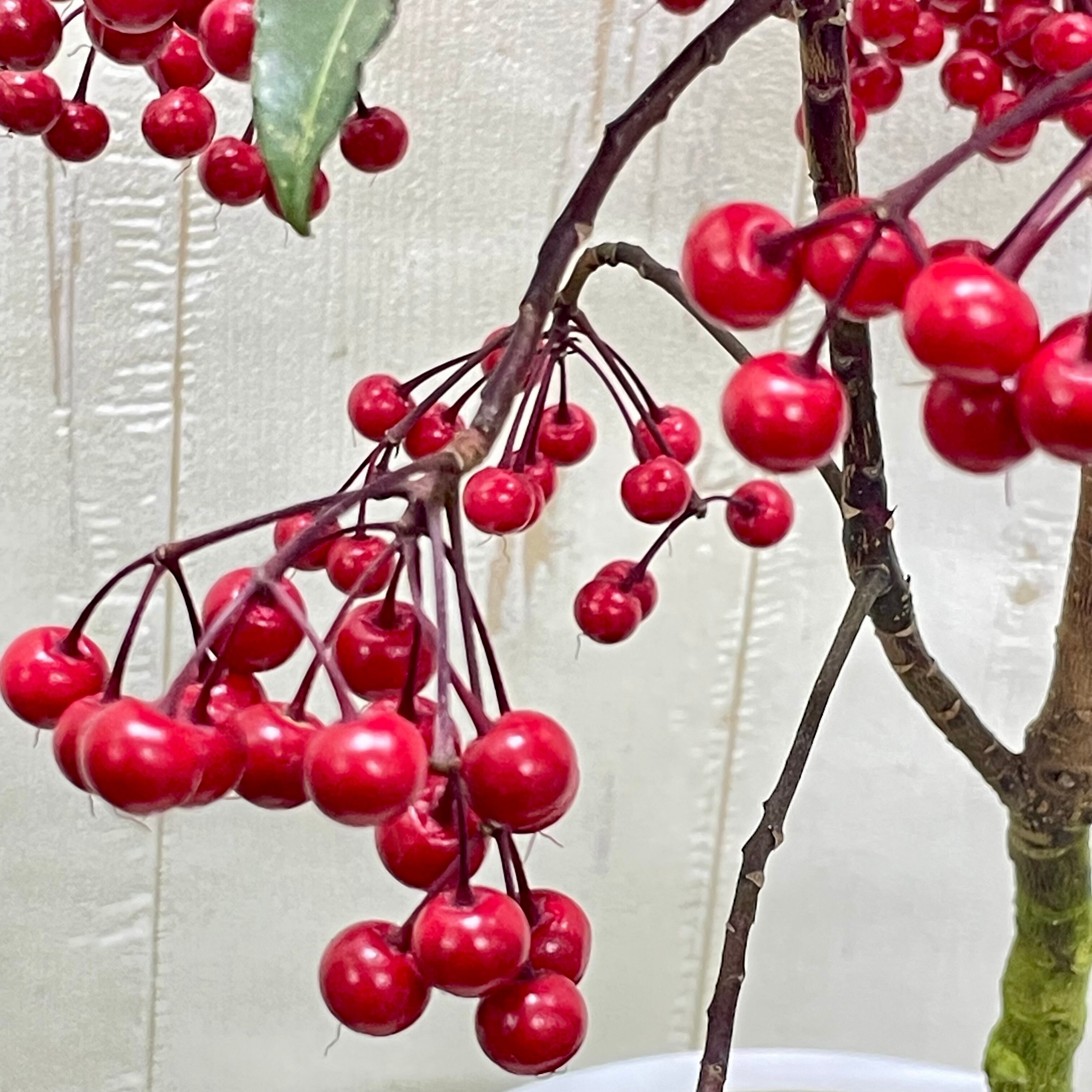 赤い実がたっぷりと房状に垂れ、華やかな存在感があります。