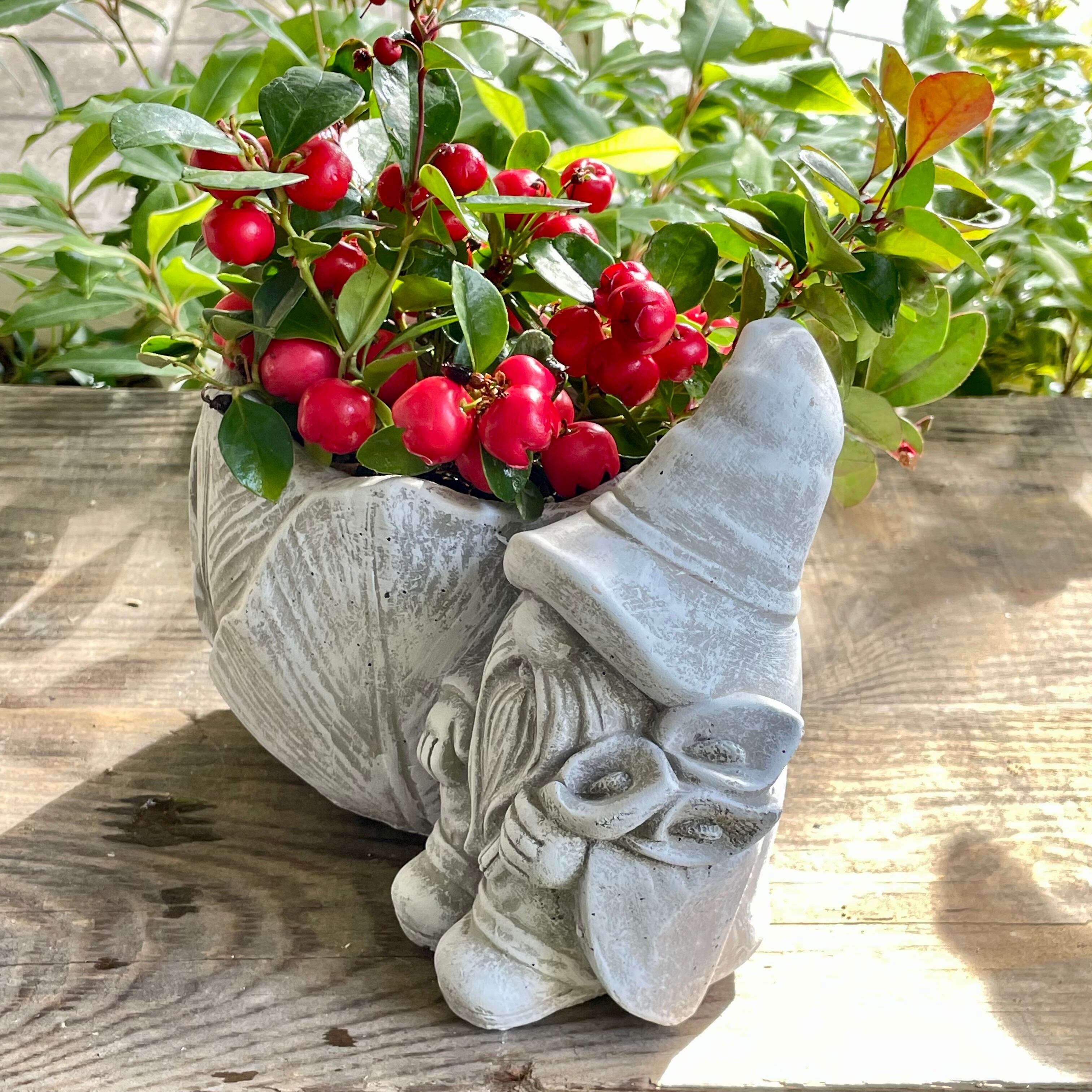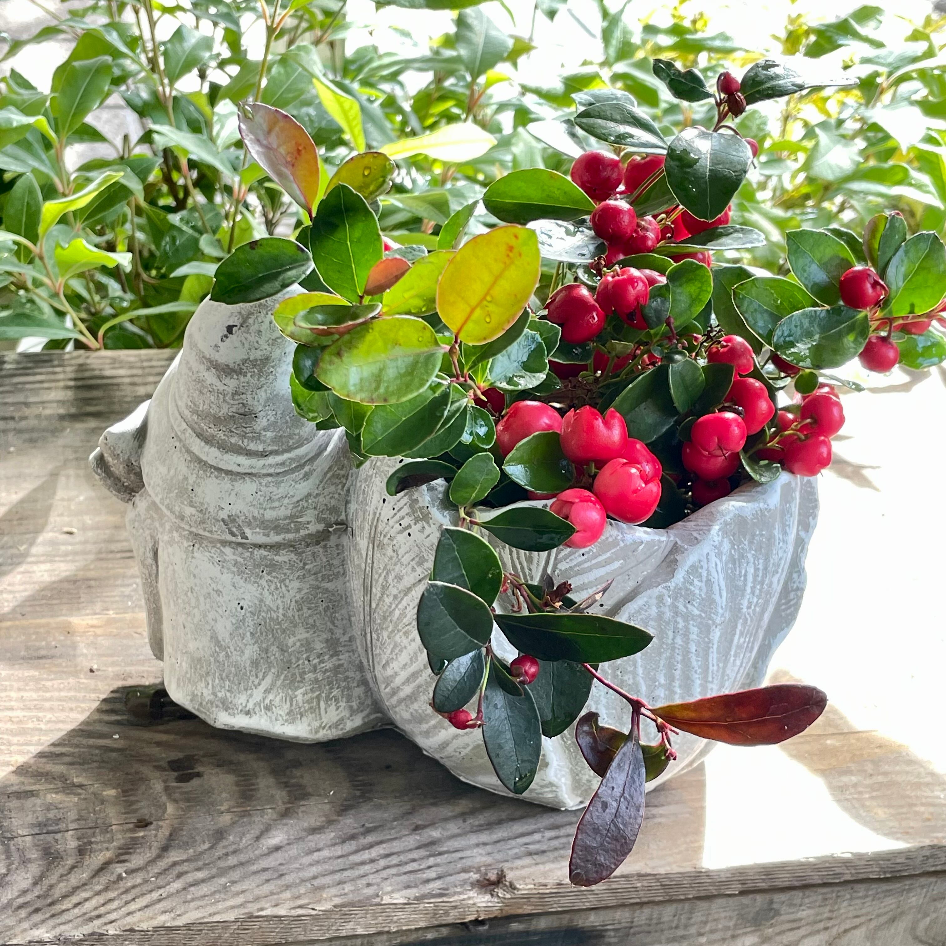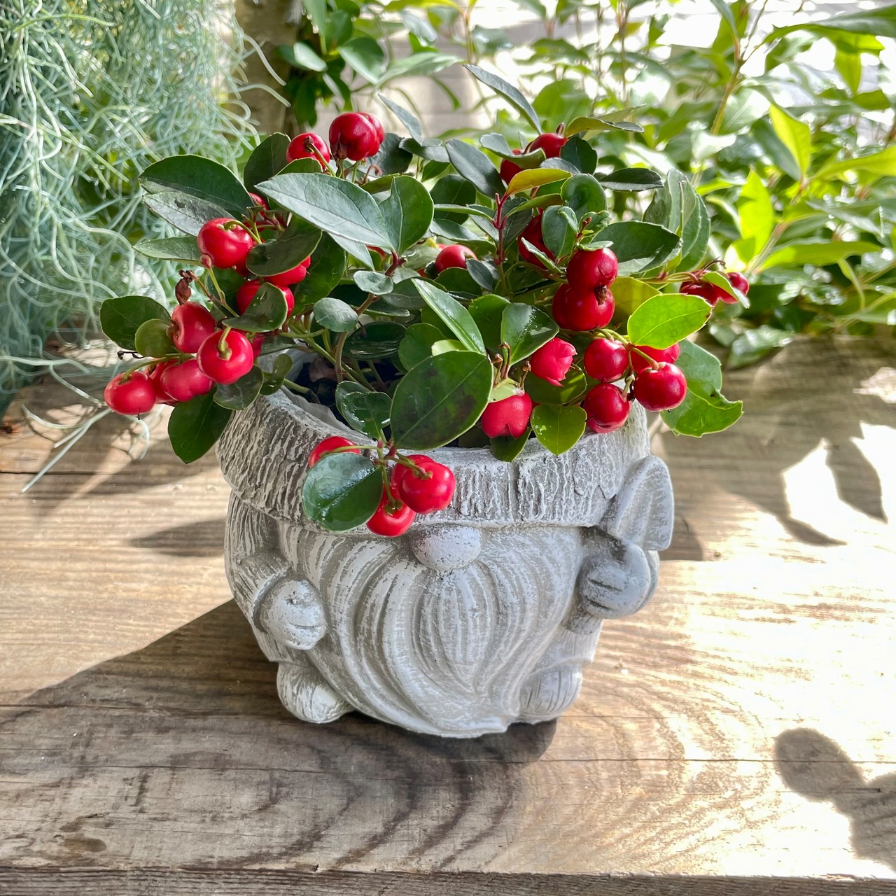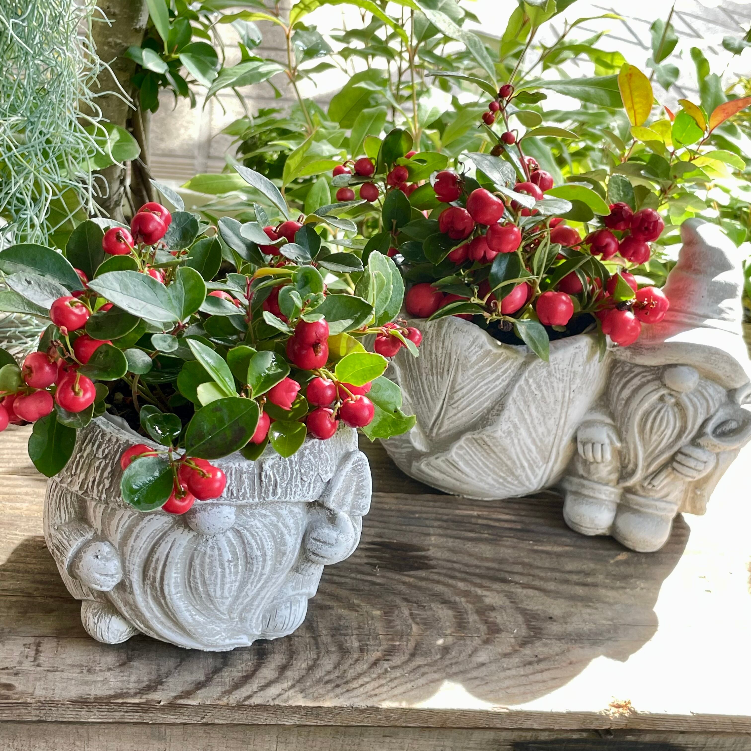そんなノームをかたどったセメントポットと、柔らかな表情のサンタポットに、冬の赤い実が美しいチェッカーベリーを植え込みました。