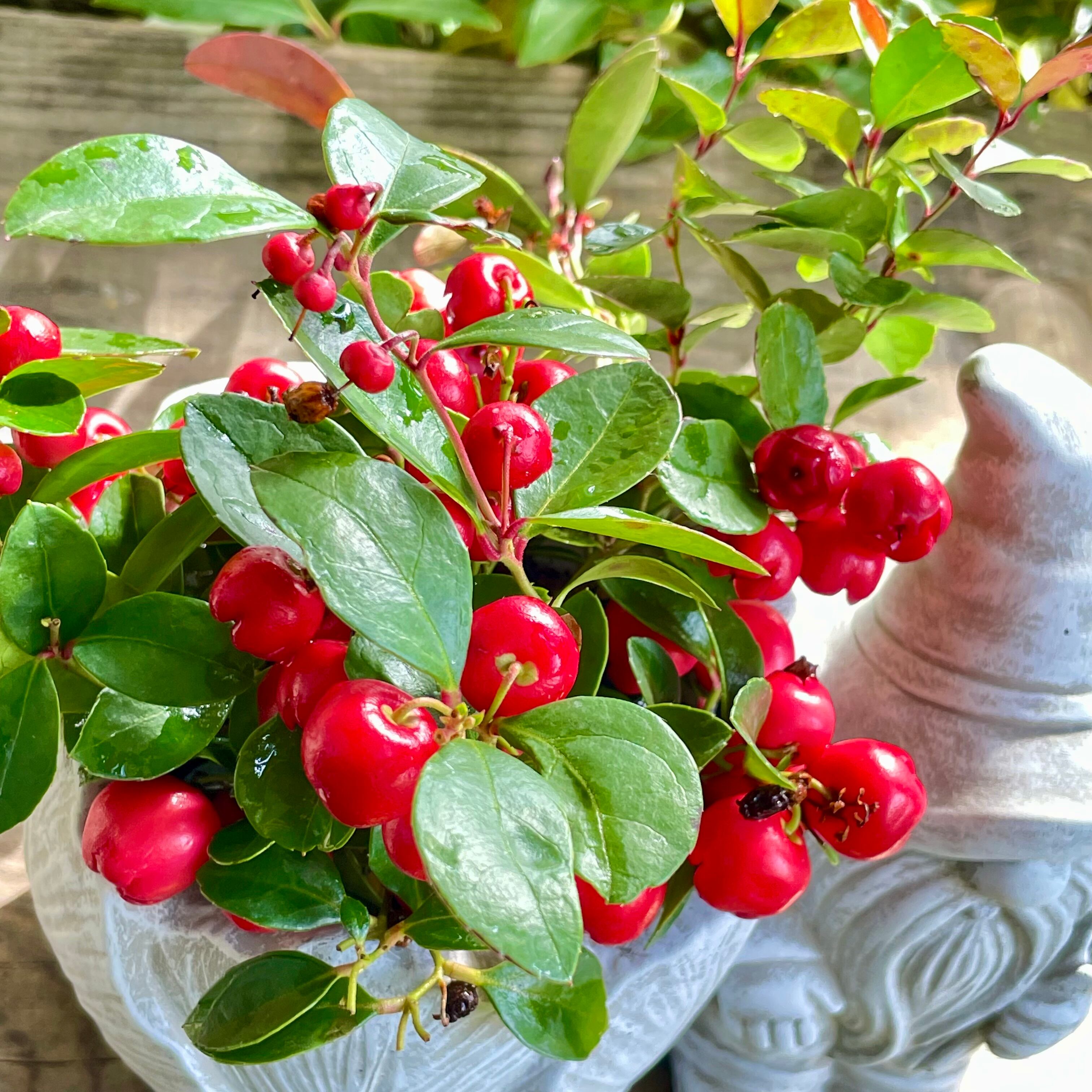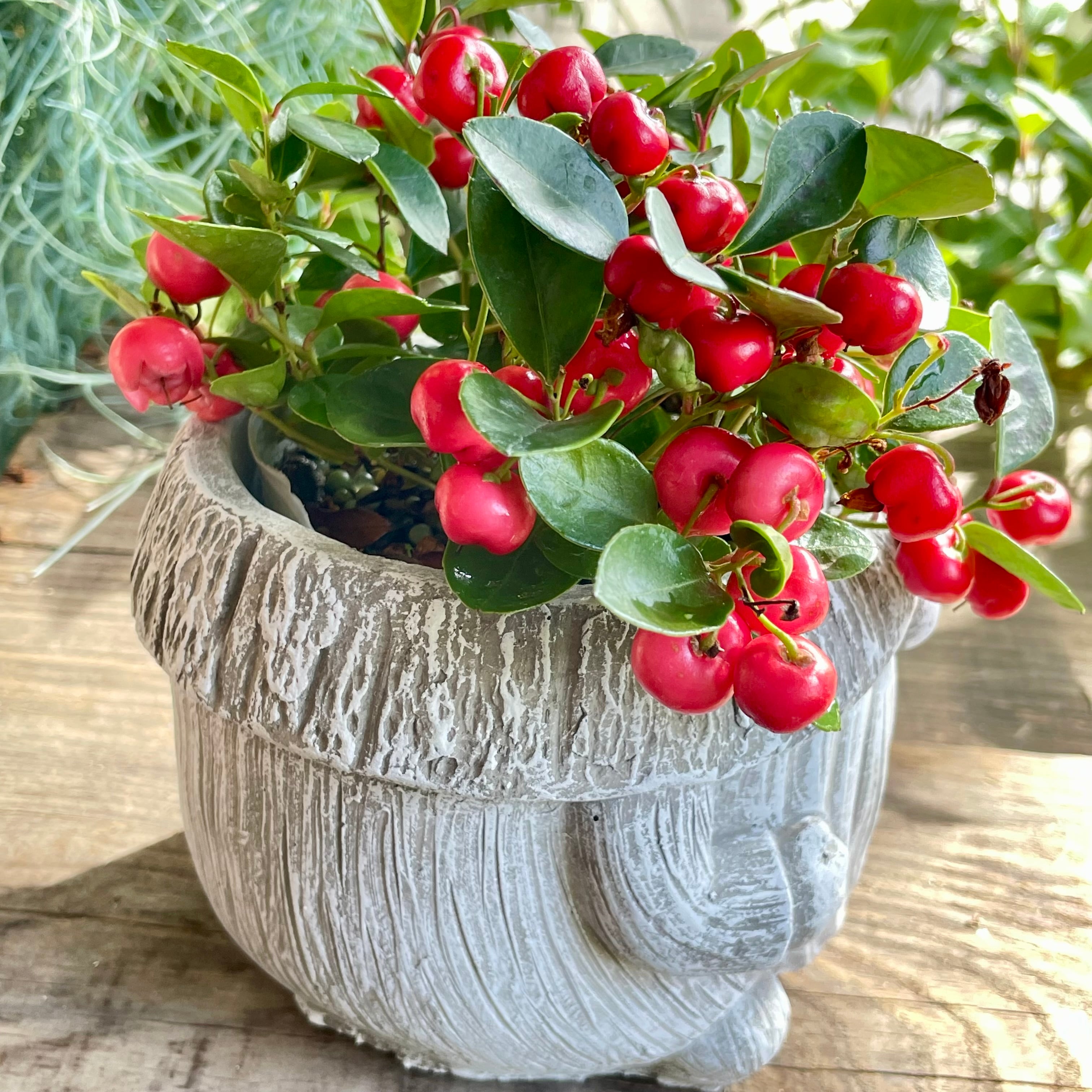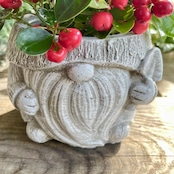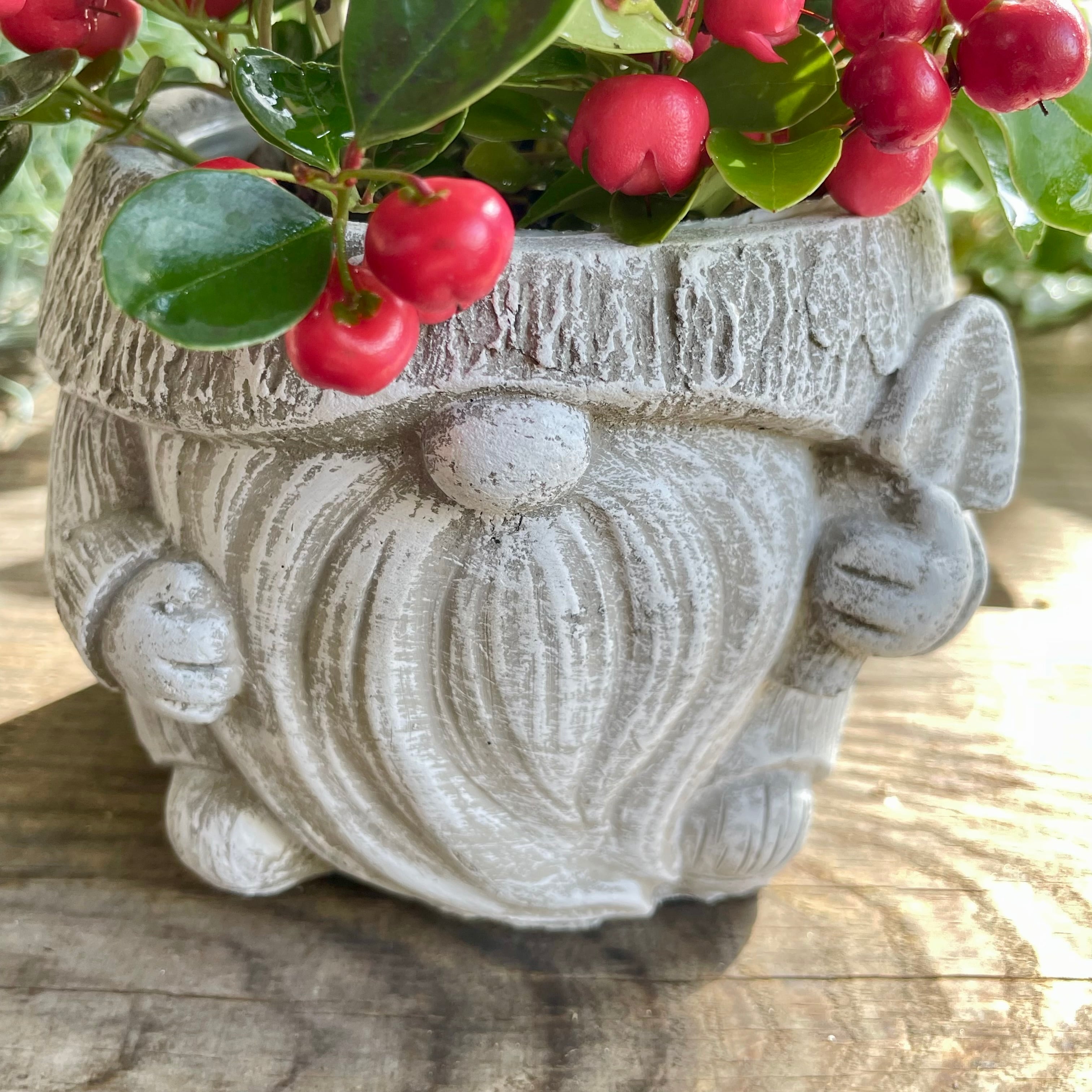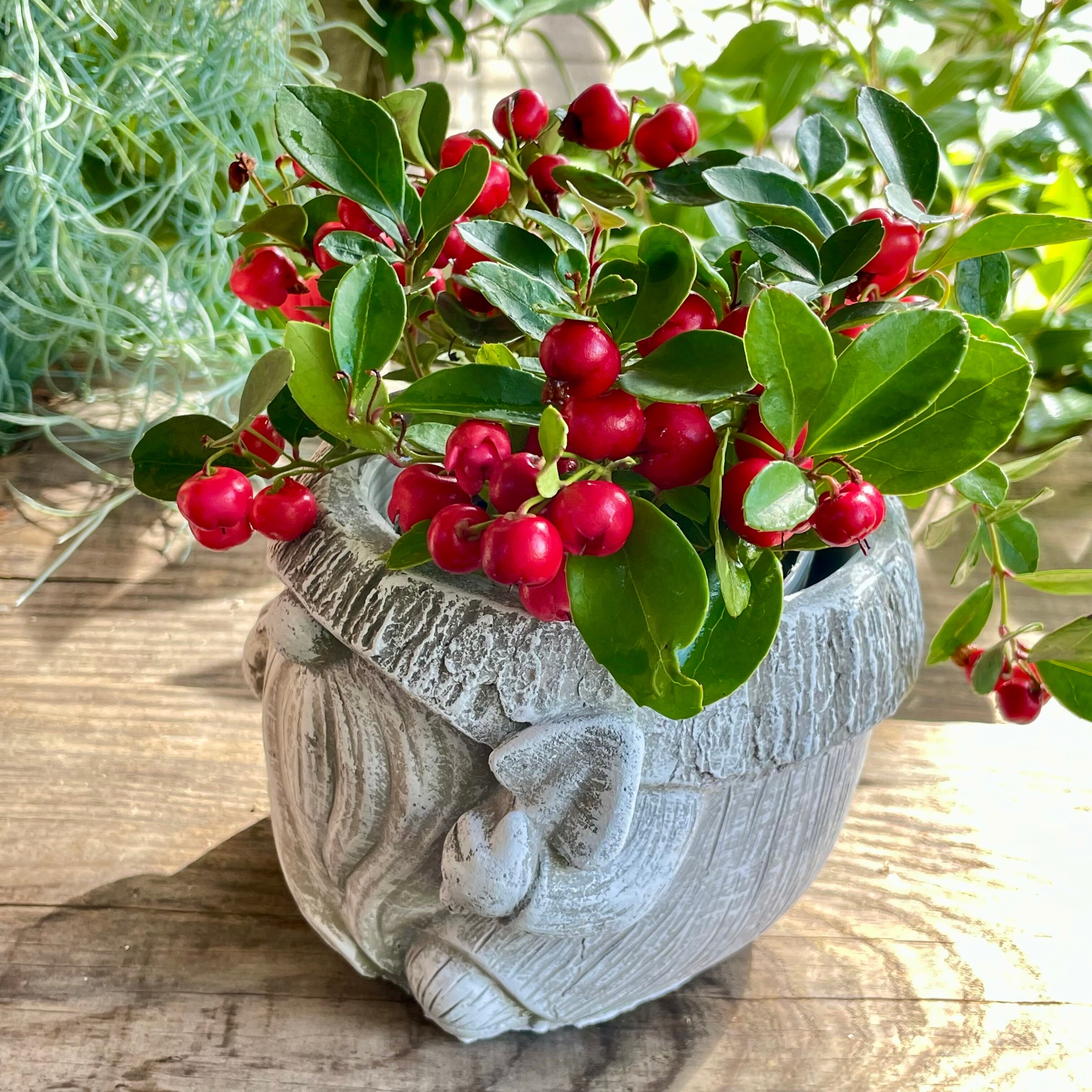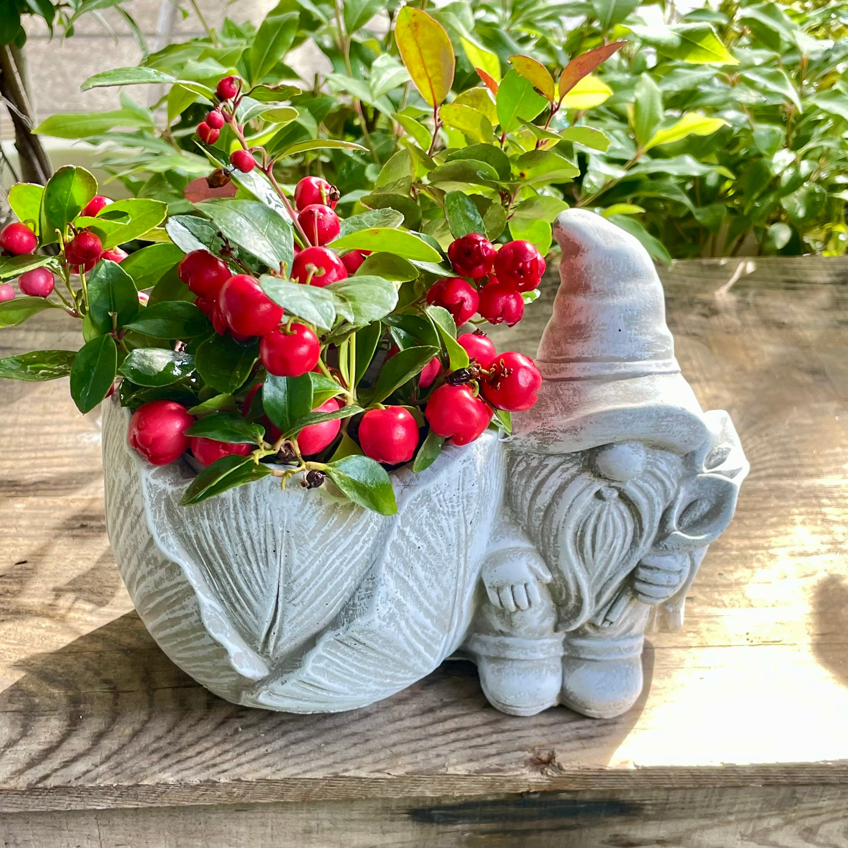 そんなノームをかたどったセメントポットと、柔らかな表情のサンタポットに、冬の赤い実が美しいチェッカーベリーを植え込みました。