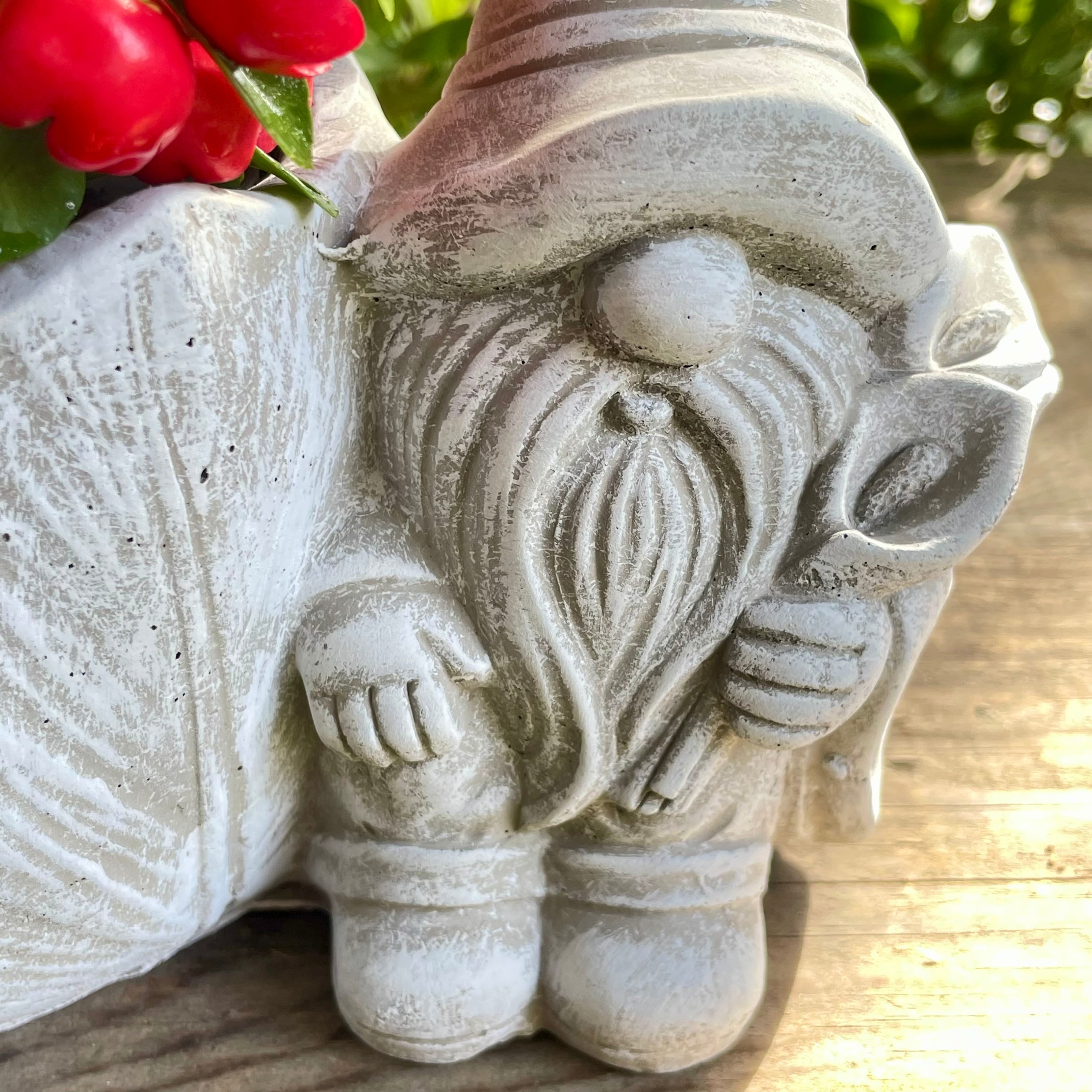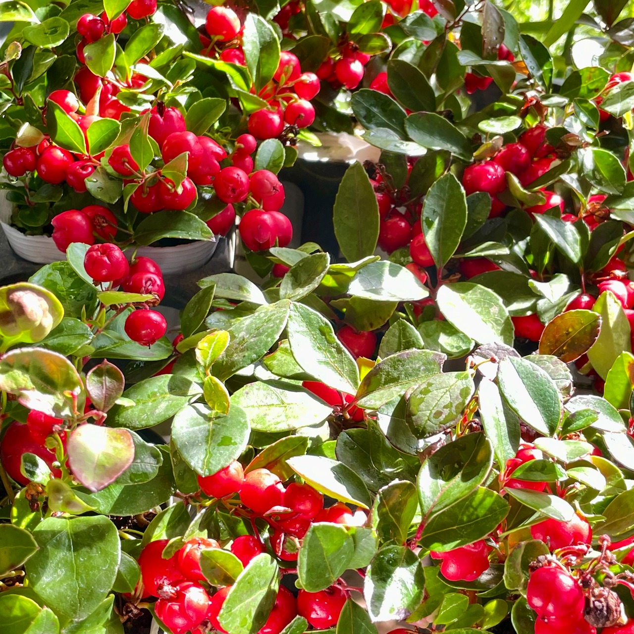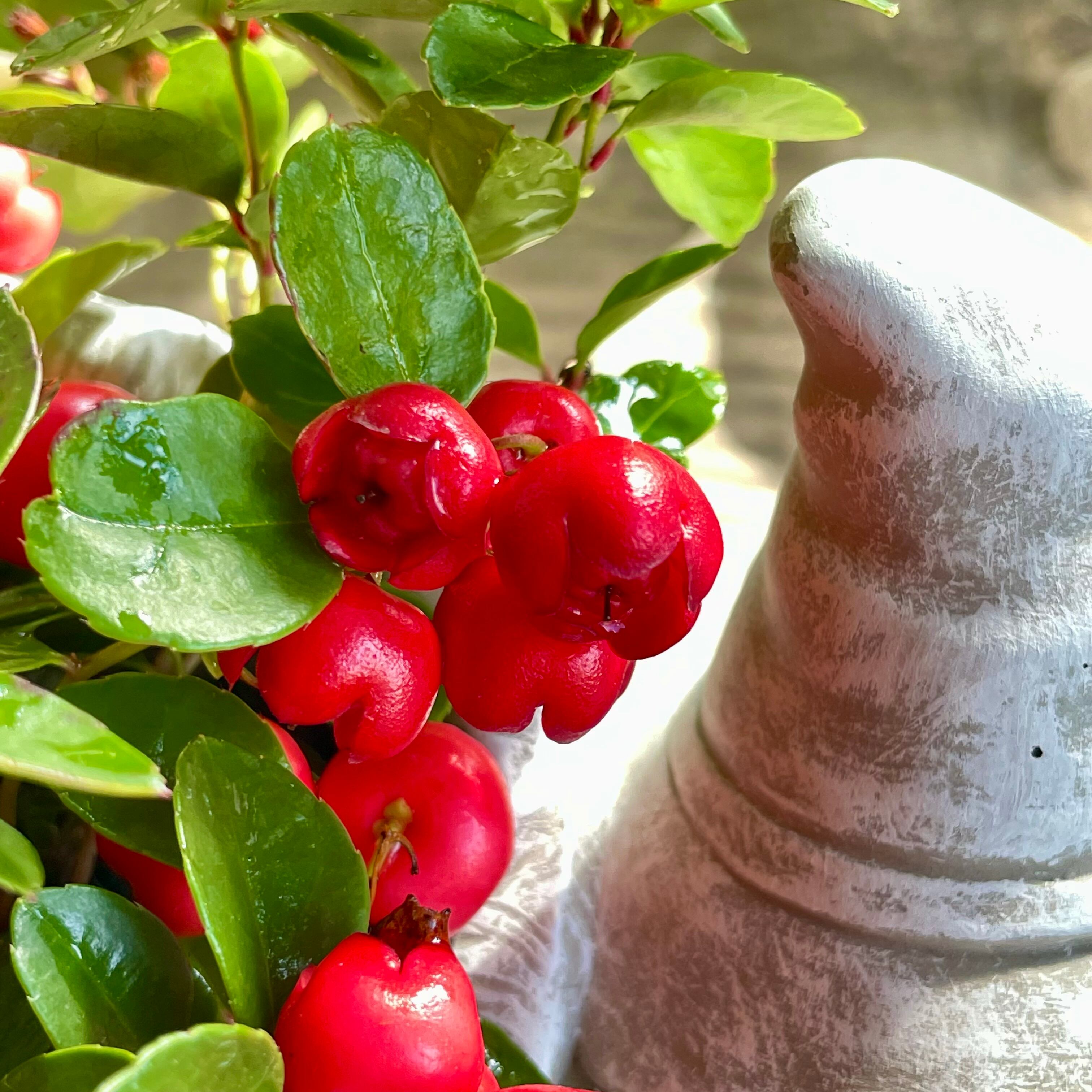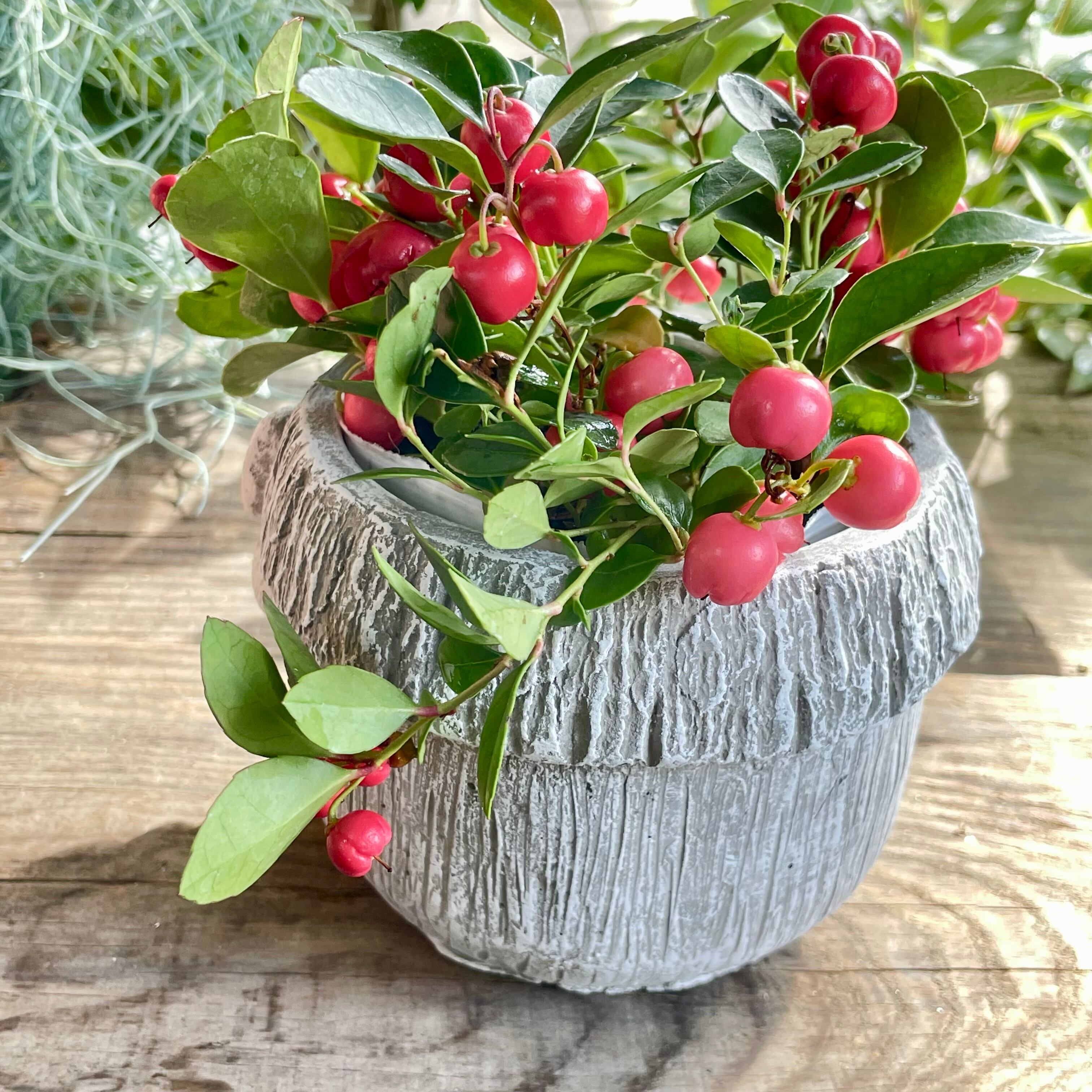 そんなノームをかたどったセメントポットと、柔らかな表情のサンタポットに、冬の赤い実が美しいチェッカーベリーを植え込みました。