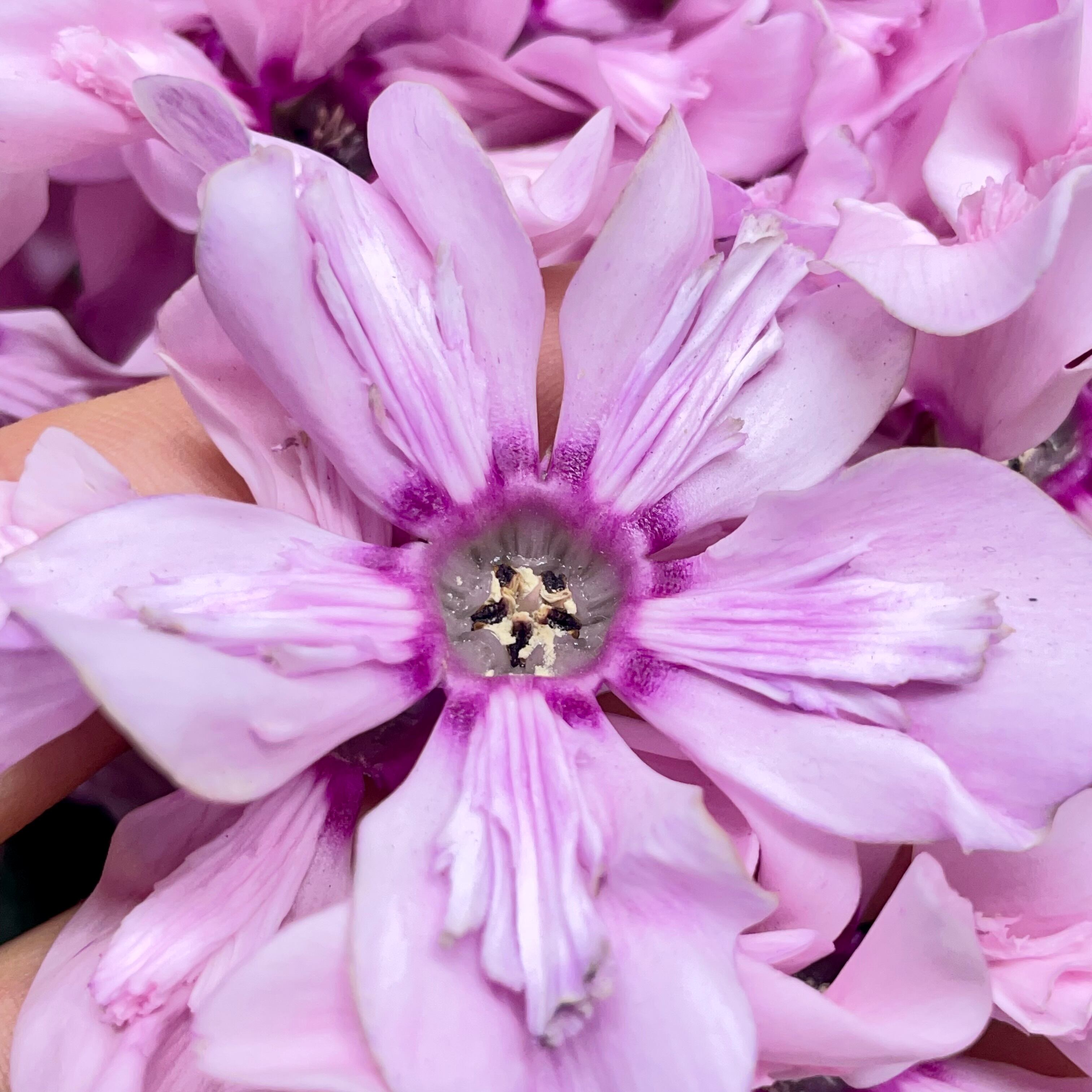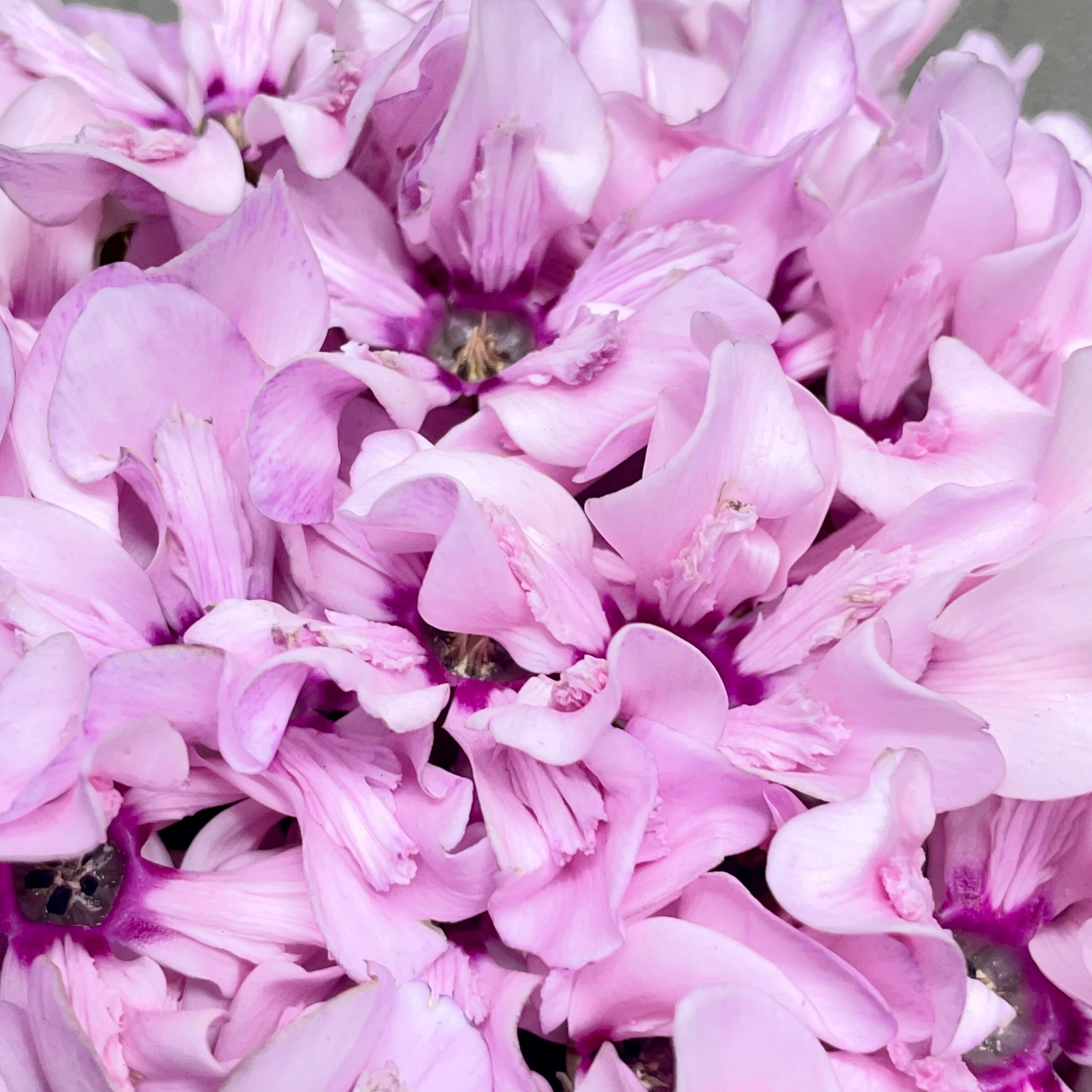 ひとつひとつの花は中心に濃いピンクのアイが入り