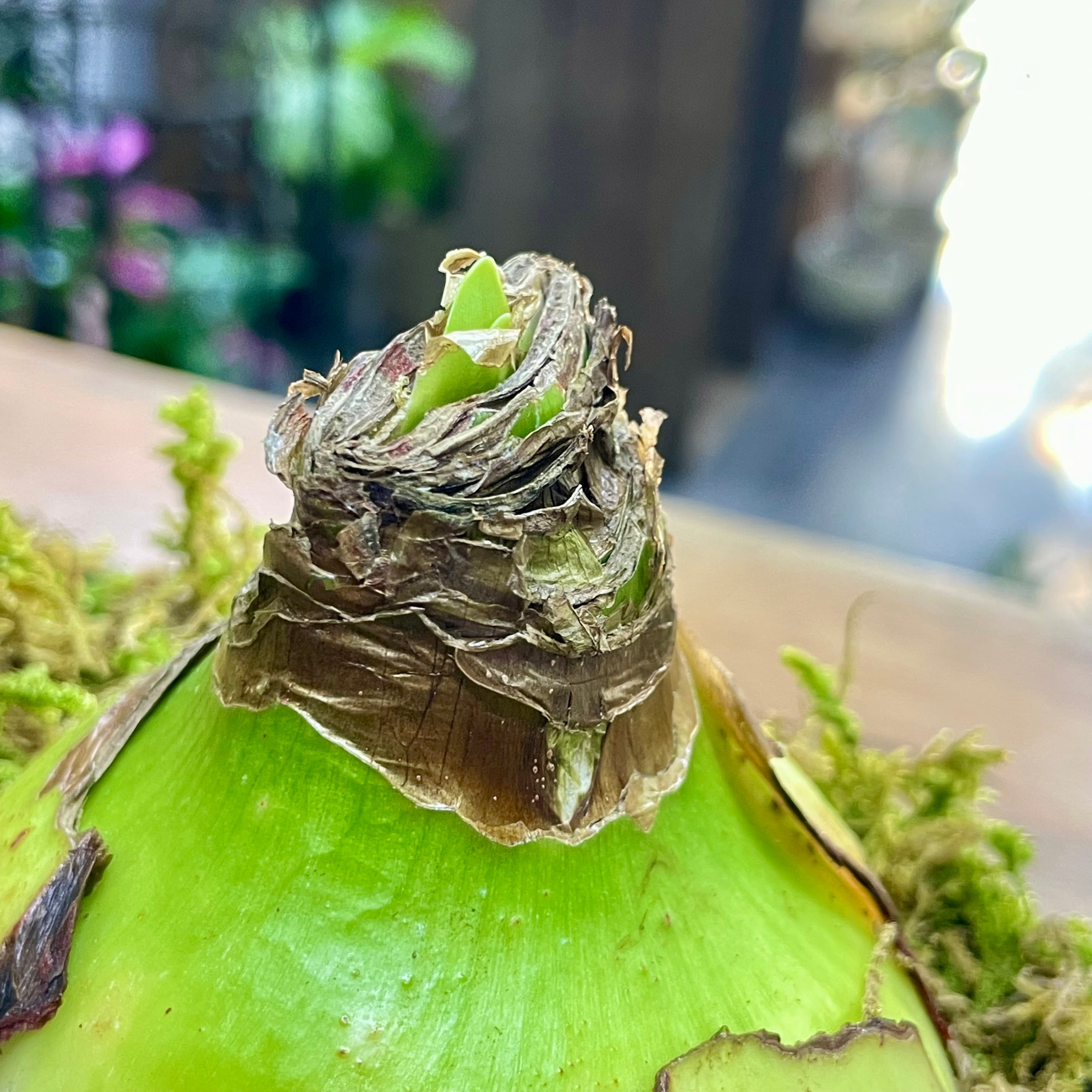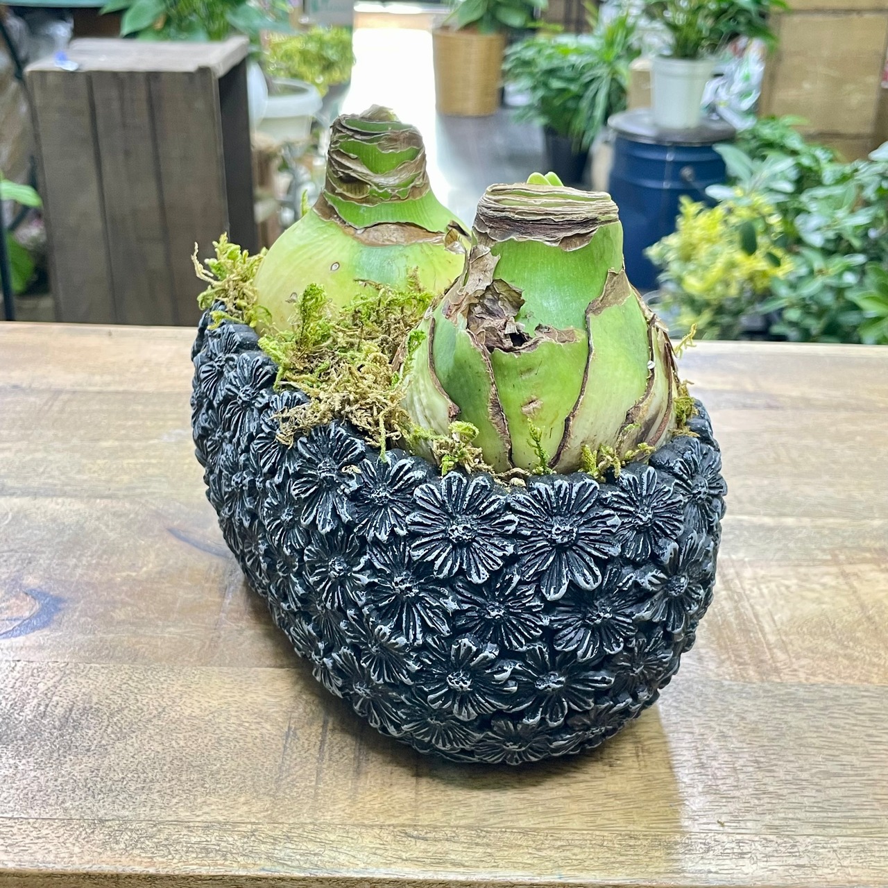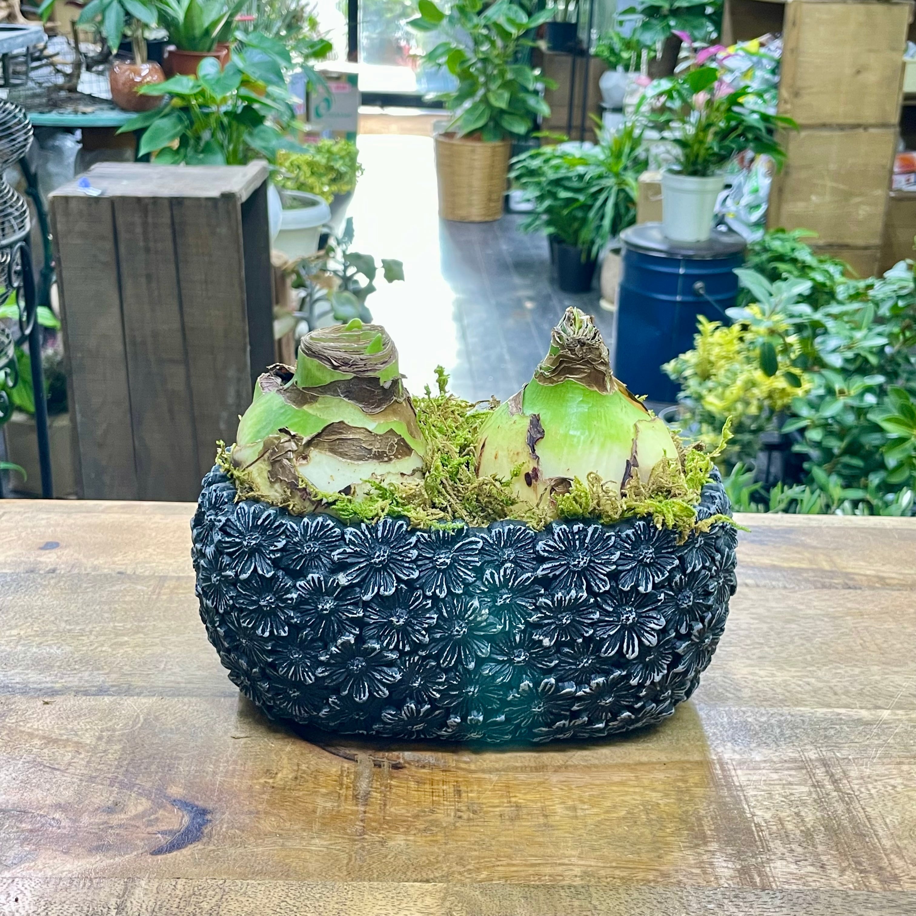 土も、水やりもいらない。 ただ置いておくだけなのに、 ある日ふと気づくと、ぐっと背を伸ばし、花芽を抱えています。 忙しい毎日の中で、手をかけすぎなくても、ちゃんと応えてくれる。 そんな安心感が、この「マジックアマリリス」のいちばんの魅力です。 マジックアマリリスは、球根そのものの力で花を咲かせる特別な植物。 土を使わず、水も与えずに育てることができ、 暖かい室内の明るい窓辺などに置くだけで、成長を始めます。 今回ご用意したのは、 2球を寄せて、落ち着いたブラックのセメント鉢に仕立てたアレンジ。 苔をあしらったナチュラルな仕上がりで、 置くだけで空間に静かな季節感を添えてくれます。 球根はおよそ6〜10週間ほどで開花します。 花芽は2〜3本出ることが多く、 開花後も次の花芽が上がってくる場合があります。 (※成長の仕方や花芽の本数は、栽培環境や球根の個体差によって異なります) 色合いは、 レモンスター(白)/スウィートニンフ(桃)/ピンクサイビスター(ローズ) エバーグリーン(緑)/ブライトニンフ(白赤)/フェラーリ(赤) などの中から、必ず2色ミックスでのお届けとなります。 並びや色の組み合わせによって、ひとつひとつ表情が異なるのも魅力です。 ⸻ 育て方について ・水やりは必要ありません ・直射日光を避けた、明るい室内に置いてください ・寒すぎる場所や、エアコンの風が直接当たる場所は避けてください 「今日はどうかな」と気にかけるのは、 気温や置き場所だけで十分です。 無理に触らず、そっと見守ることで、 球根本来の美しさが引き出されます。 ⸻ 花が終わった後の管理 花が終わった後は、 花茎のみを根元からカットし、葉は切らずに残してください。 その後、球根を鉢や地面に植え付けて育てることで、 翌年以降に再び開花する場合があります (※翌年の開花を保証するものではありません)。 なお、花数や花芽の本数は、 初年度より少なくなる可能性があります。 「育てて楽しむ」工程も含めて、 長く付き合っていただけたら嬉しいです。 ⸻ サイズ ・全体高さ:約15cm(セメント鉢底〜球根先端まで) ・球根幅:1球 約10cm ・鉢サイズ:外寸 約W215 × D130 × H95mm ・鉢内寸:約W185 × D100mm (ブラック セメント鉢) 棚の一角や、ダイニングカウンター、ベッドサイドにも置きやすく、 ふと視線を向けたときに、季節の移ろいを感じさせてくれるサイズ感です。 ⸻ ※球根・植物のため個体差がございます。 ※日々成長していますので、画像の状態と異なる場合がございます。 ※球根の配色は、基本的にお任せになりますが、必ず2色ミックスでお届けになります。 ご希望がある場合は、購入前にご連絡をいただくか、備考欄に記載してください。 在庫状況によりご希望に添えない場合がございますので、予めご了承ください。