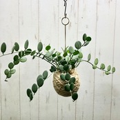 鉢から取り出したグリーンドラムを水苔で丁寧に巻いて、ジュートシートとジュートヒモでしっかりとした完成度の高い麻玉ハンギングにしております(^.^)