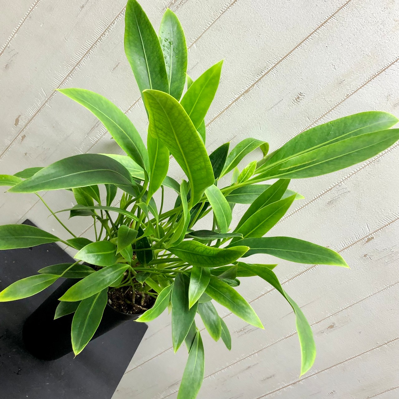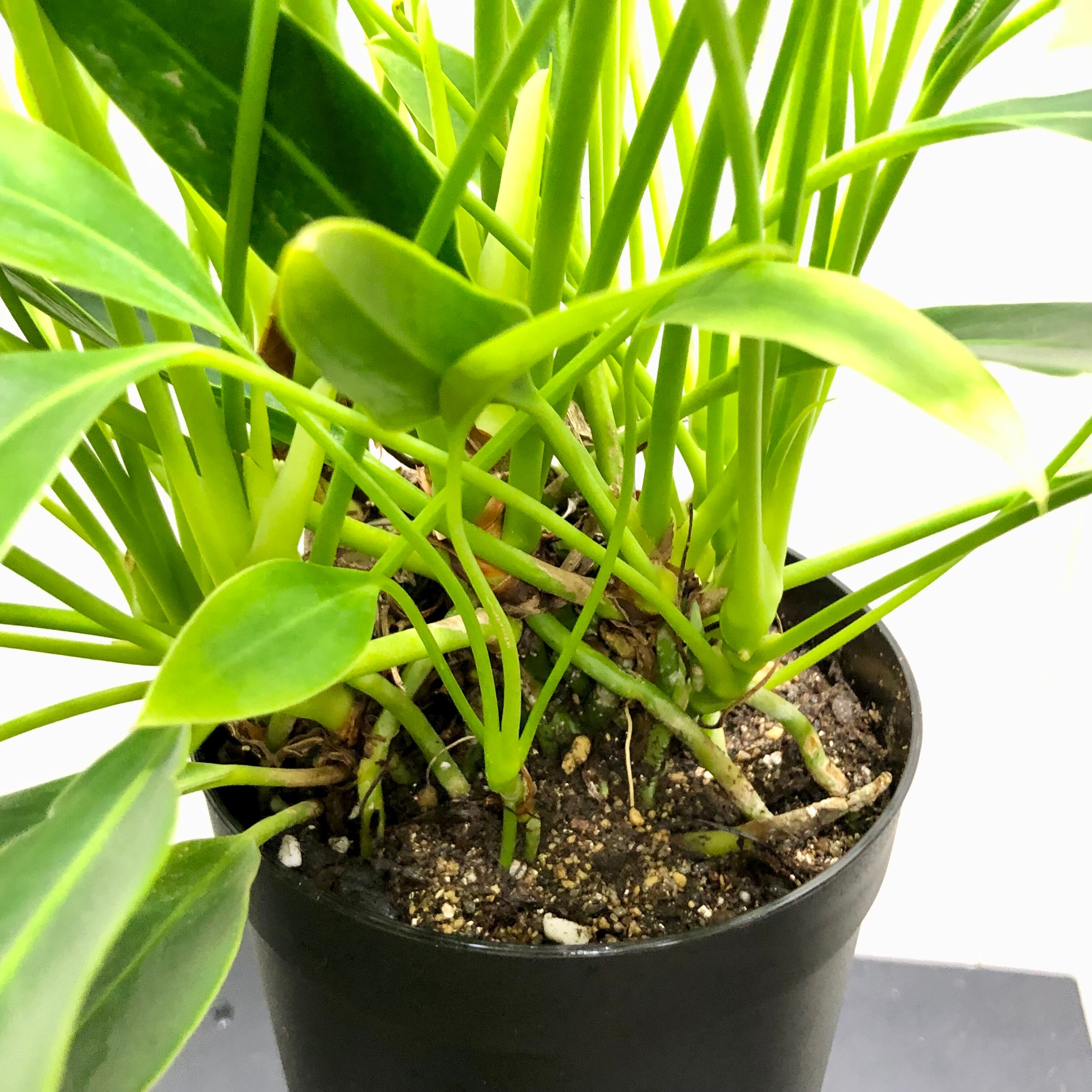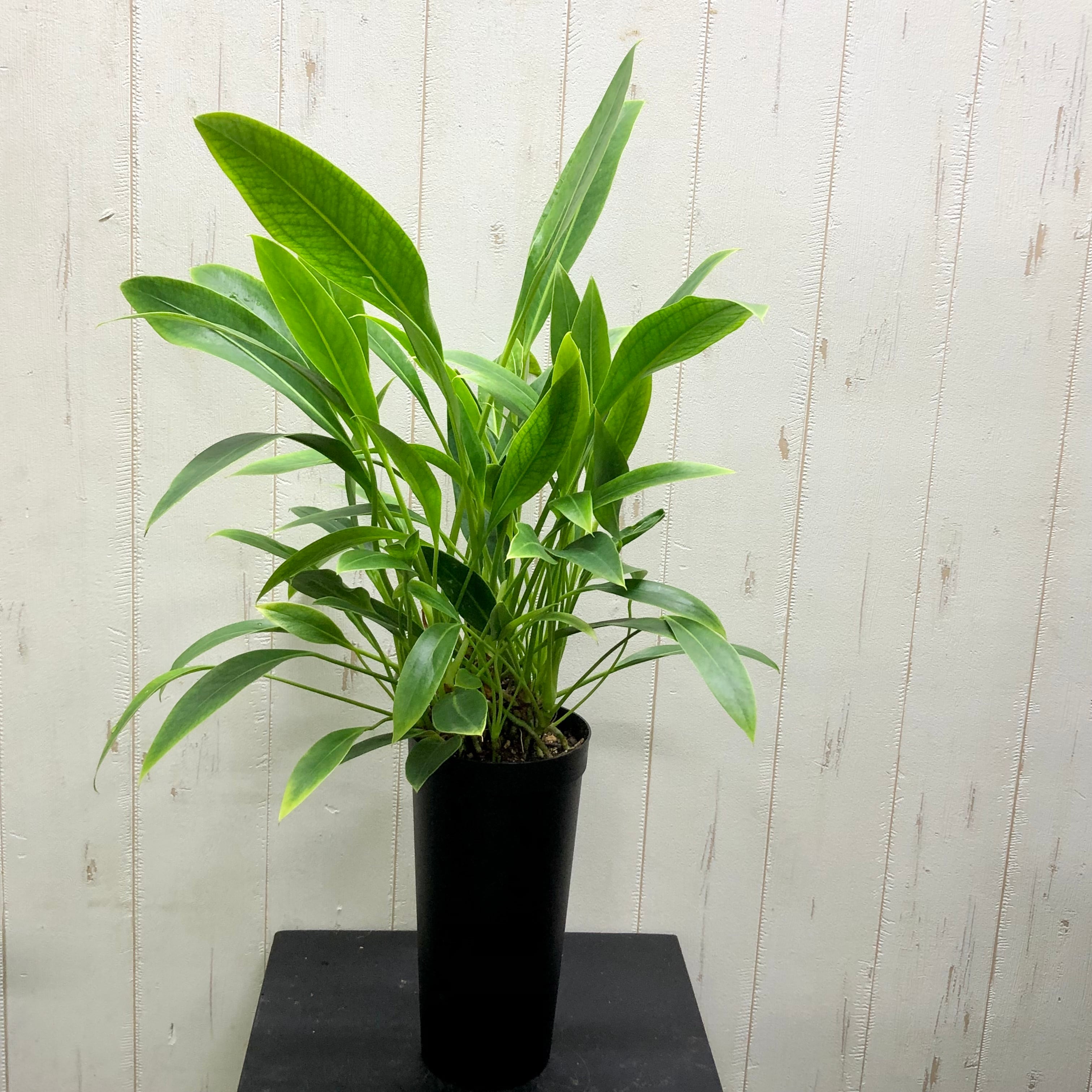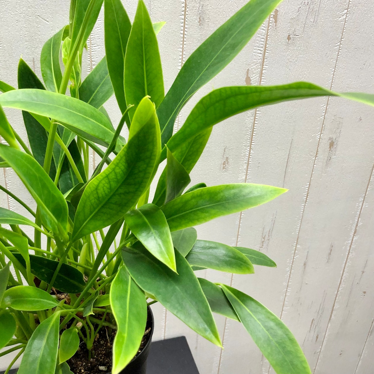 アンスリウムの葉っぱは、大きくウチワのような形をしてたりハート型のような葉っぱがほとんどですが、こちらは細長くすっと立ち上がる葉姿が非常にシンプルで美しいです。